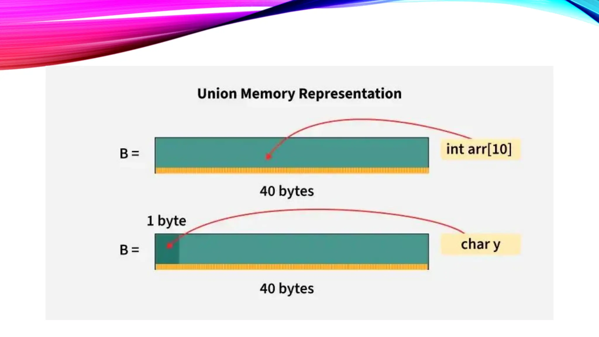 #include <stdio.h> union A { intx; char y; }; union B{ int arr[10]; char y; }; int main() { printf("Sizeof A: %ldn", sizeof(union A)); printf("Sizeof B: %ldn", sizeof(union B)); return 0; }