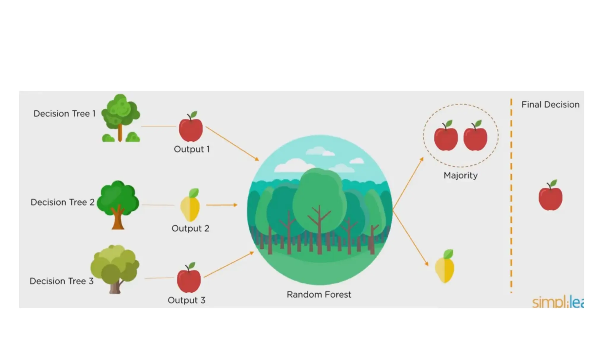 HOW RANDOM FORESTWORKS • Step 1: Select the random samples from a given dataset • Step 2 : Construct a decision tree from each sample and get a prediction result from each decision tree • Step 3: Perform a vote for each predicted result • Step 4: Select the prediction result with the most votes as the final prediction