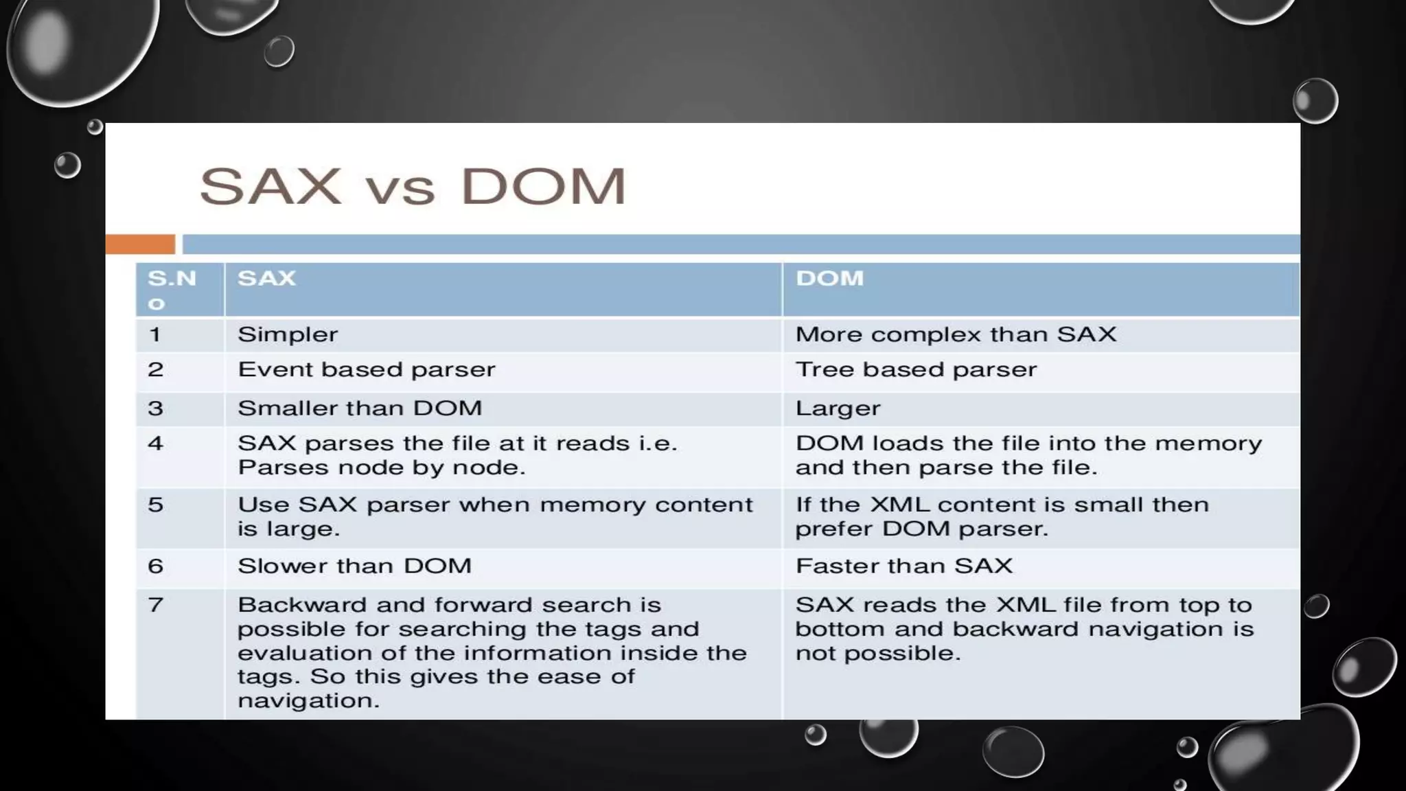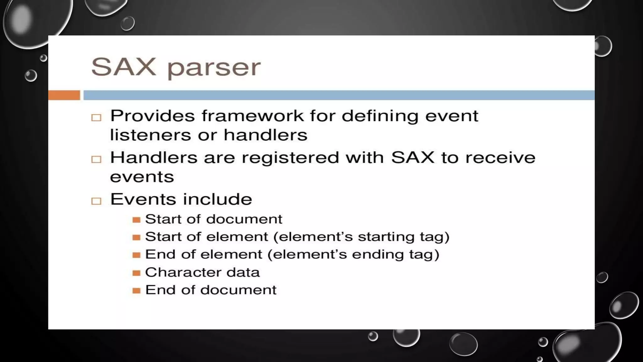 SAX (Simple API for XML) is an event-driven algorithm for parsing XML documents that provides an alternative to the DOM (Document Object Model). SAX generates no parse tree and operates by issuing parsing events as it makes a single pass through the XML input stream, while DOM builds the full AST of an XML document. SAX is used for state-independent processing of XML documents when the document is processed linearly from top to bottom and is not deeply rooted or very large.