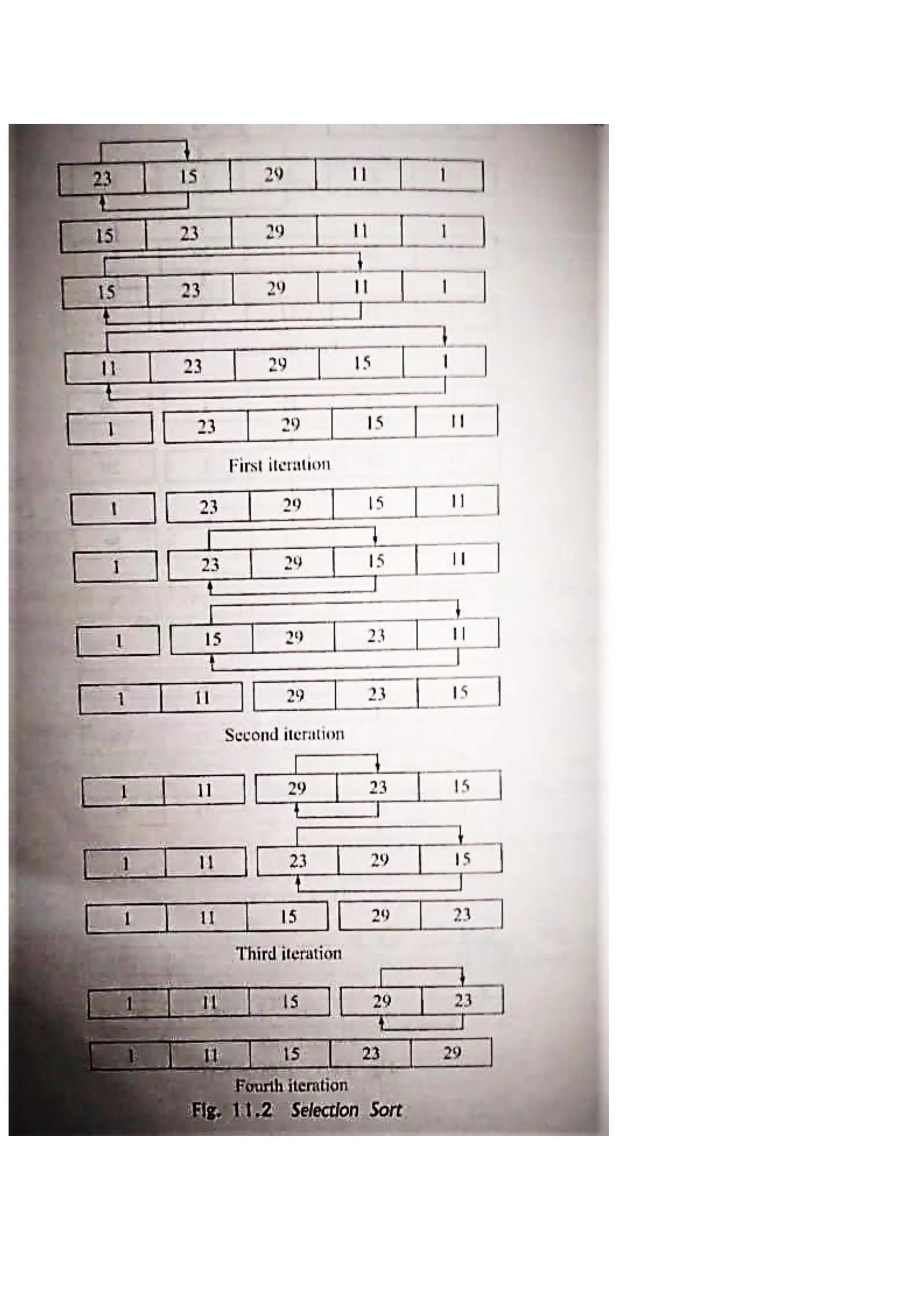 The document explains searching methods in arrays, primarily focusing on linear and binary search algorithms. Linear search is a simple technique that checks each element sequentially and has a time complexity of O(n), while binary search works efficiently with sorted arrays, using a divide-and-conquer approach with a time complexity of O(log n). It also briefly covers sorting methods, including bubble sort, insertion sort, and selection sort, along with their complexity and operational details.