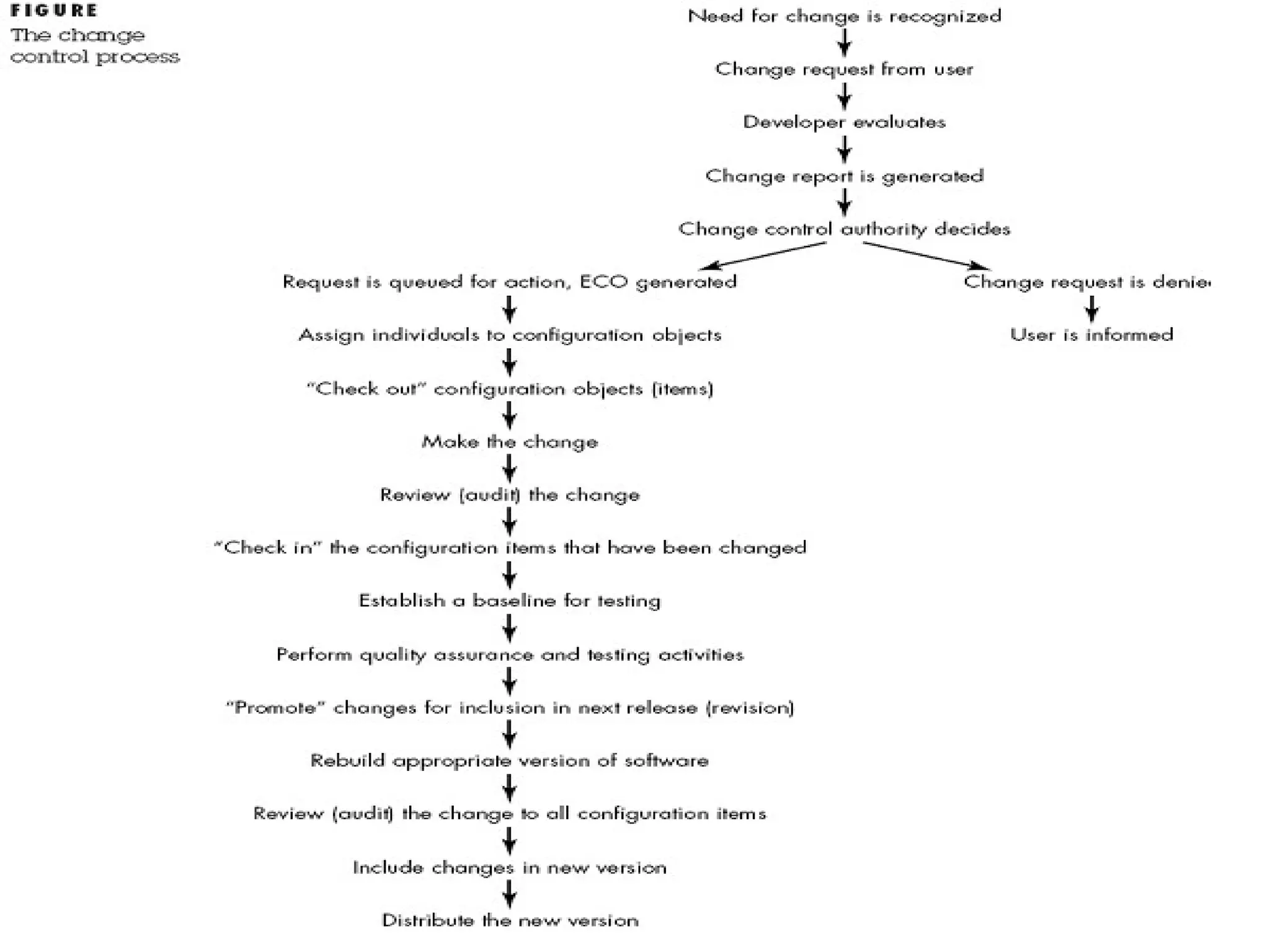 Change Control • Changerequest is submitted and evaluated to assess technical merit and impact on the other configuration objects and budget. • Change report contains the results of the evaluation. • Change control authority (CCA) makes the final decision on the status and priority of the change based on the change report. • Engineering change order (ECO) is generated for each change approved . • Object to be changed is checked-out of the project database subject to access control parameters for the object. • Modified object is subjected to appropriate SQA and testing procedures. • Modified object is checked-in to the project database and version control mechanisms are used to create the next version of the software. • Synchronization control is used to ensure that parallel changes made by different people don’t overwrite one another.
