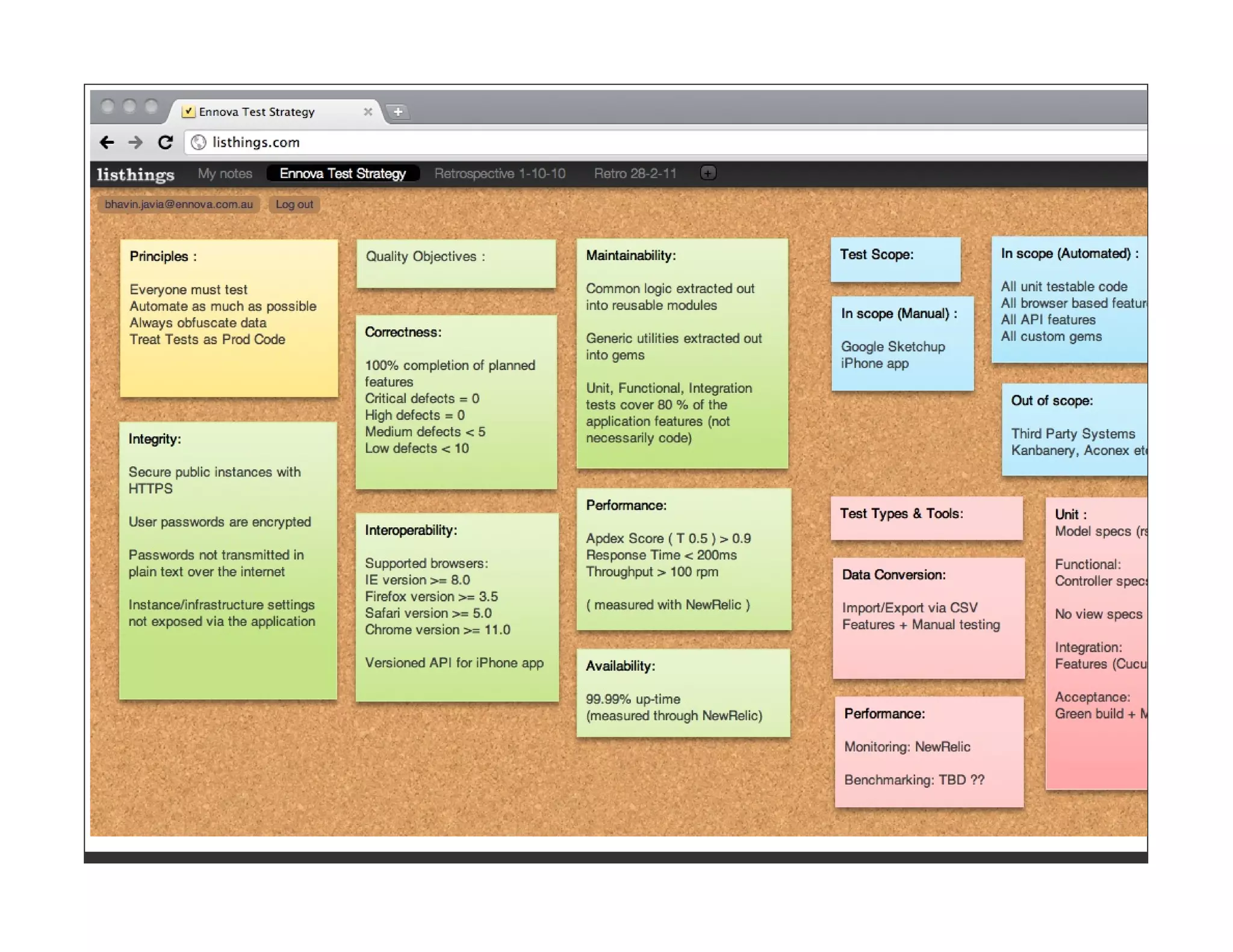 This document provides an overview of software quality and test strategies for Ruby and Rails applications. It discusses the importance of quality, managing quality through setting goals and measuring metrics. It outlines a test strategy template and covers test types, tools, and approaches for unit, integration, acceptance and other types of tests in Ruby/Rails. It also discusses test data management, defect management, and the Ruby/Rails testing ecosystem including various testing frameworks and quality/metrics tools.