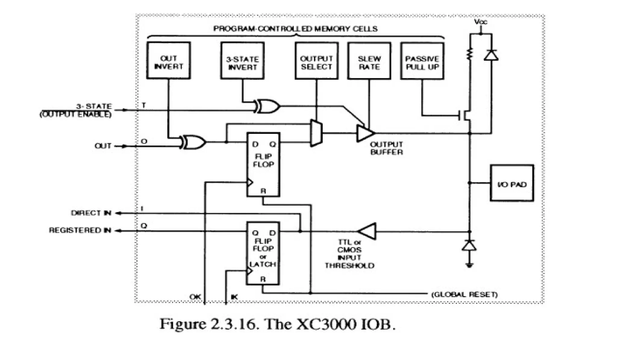 Key Features The internalstructure of the XC3000 IOB includes: Top Section (Output Path): • Output D flip-flop. • Logic gates for output control. • Program-controlled memory cells. • Output buffer with slew rate and passive pull-up. Bottom Section (Input Path): • I/O pad input signal enters a TTL/CMOS level detector. • Signal branches to direct input and registered input paths. • Flip-flop or latch used for registered input.
