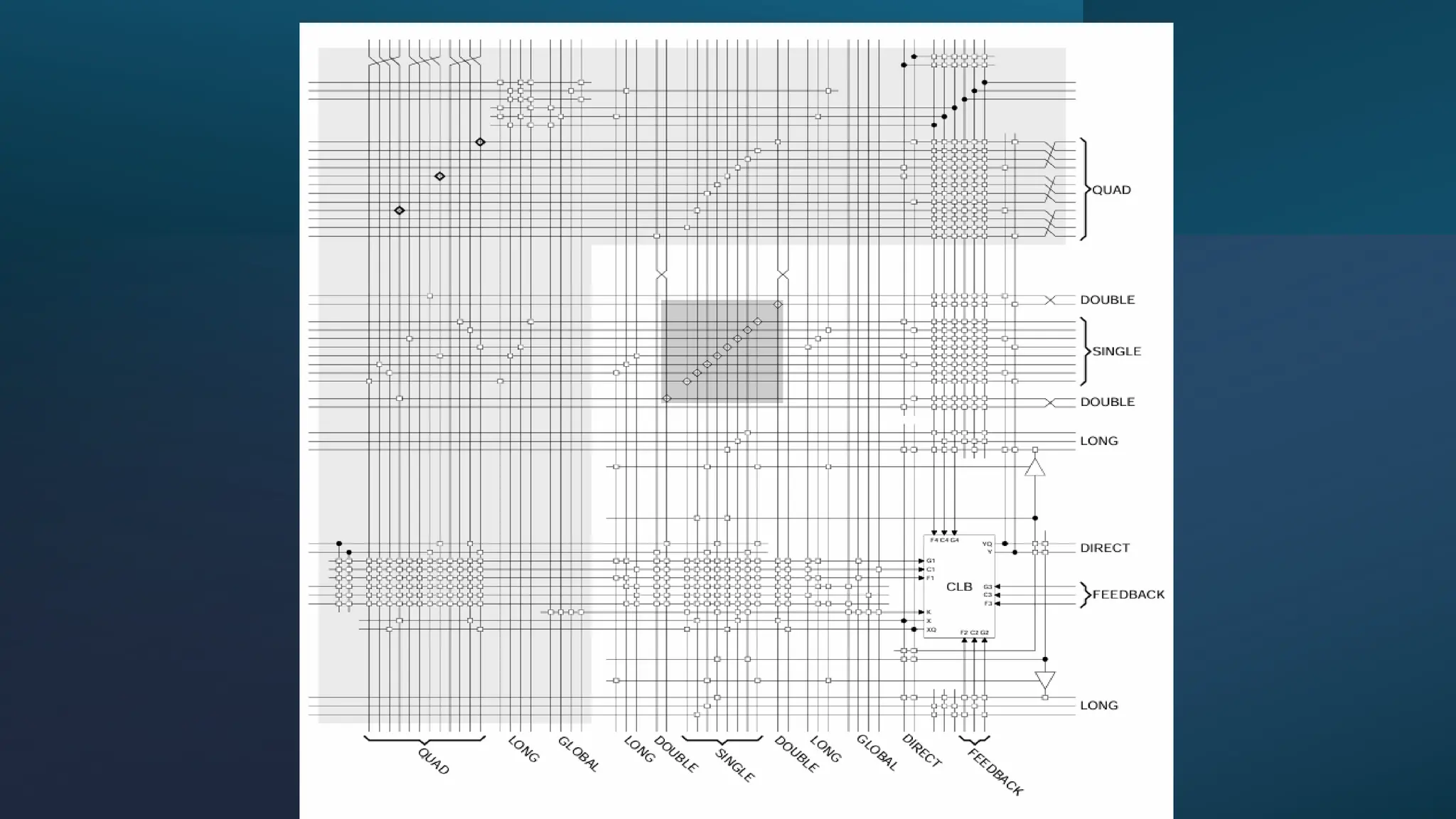 CLB Routing Connections EachCLB has associated routing resources. Inputs and outputs are on all four sides to enhance flexibility and symmetry. The switch matrix in each CLB enables interconnection across lines. XC4000X has: - Additional shaded areas (routing resources) within CLBs - More efficient routing for larger or complex designs