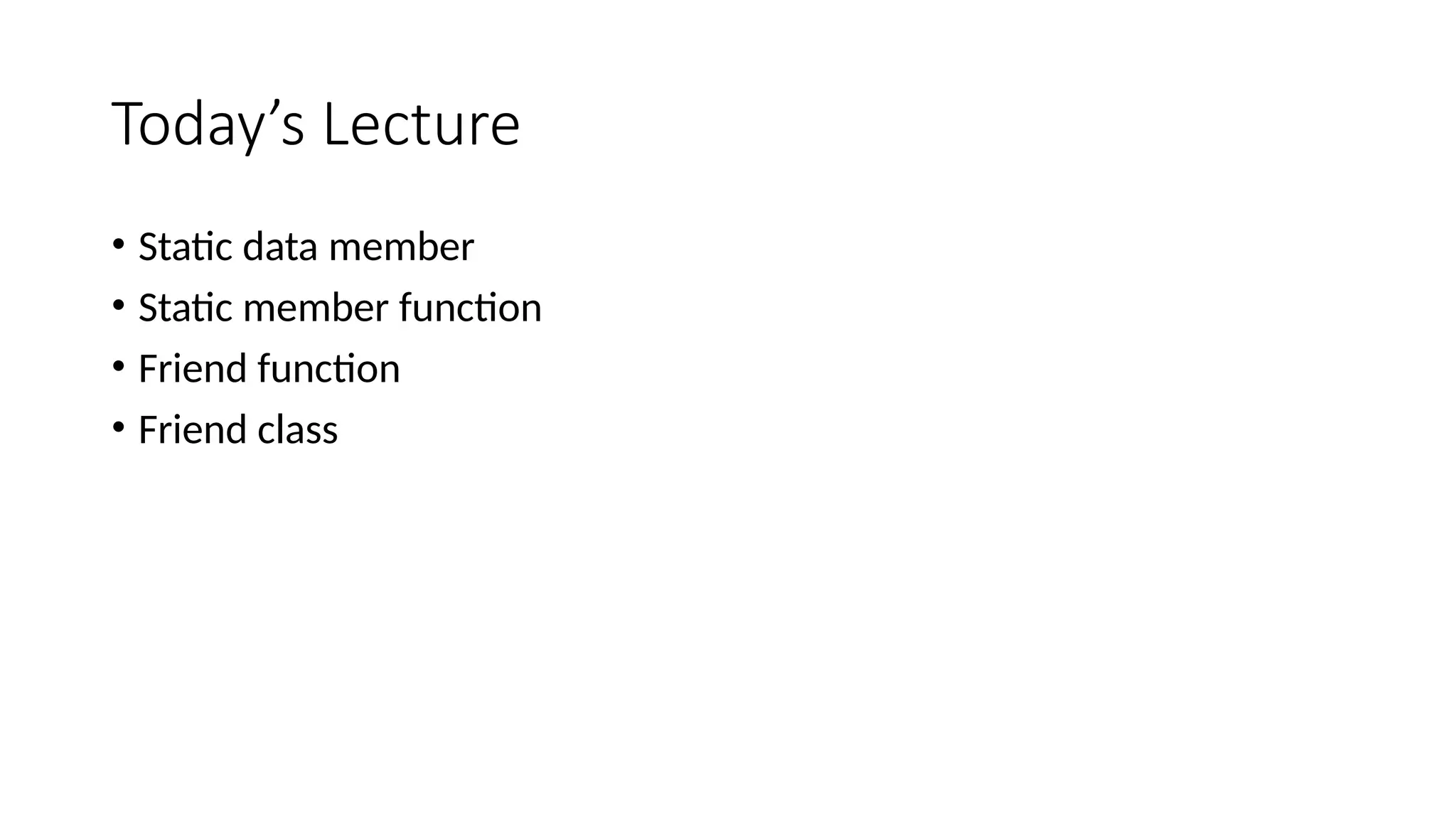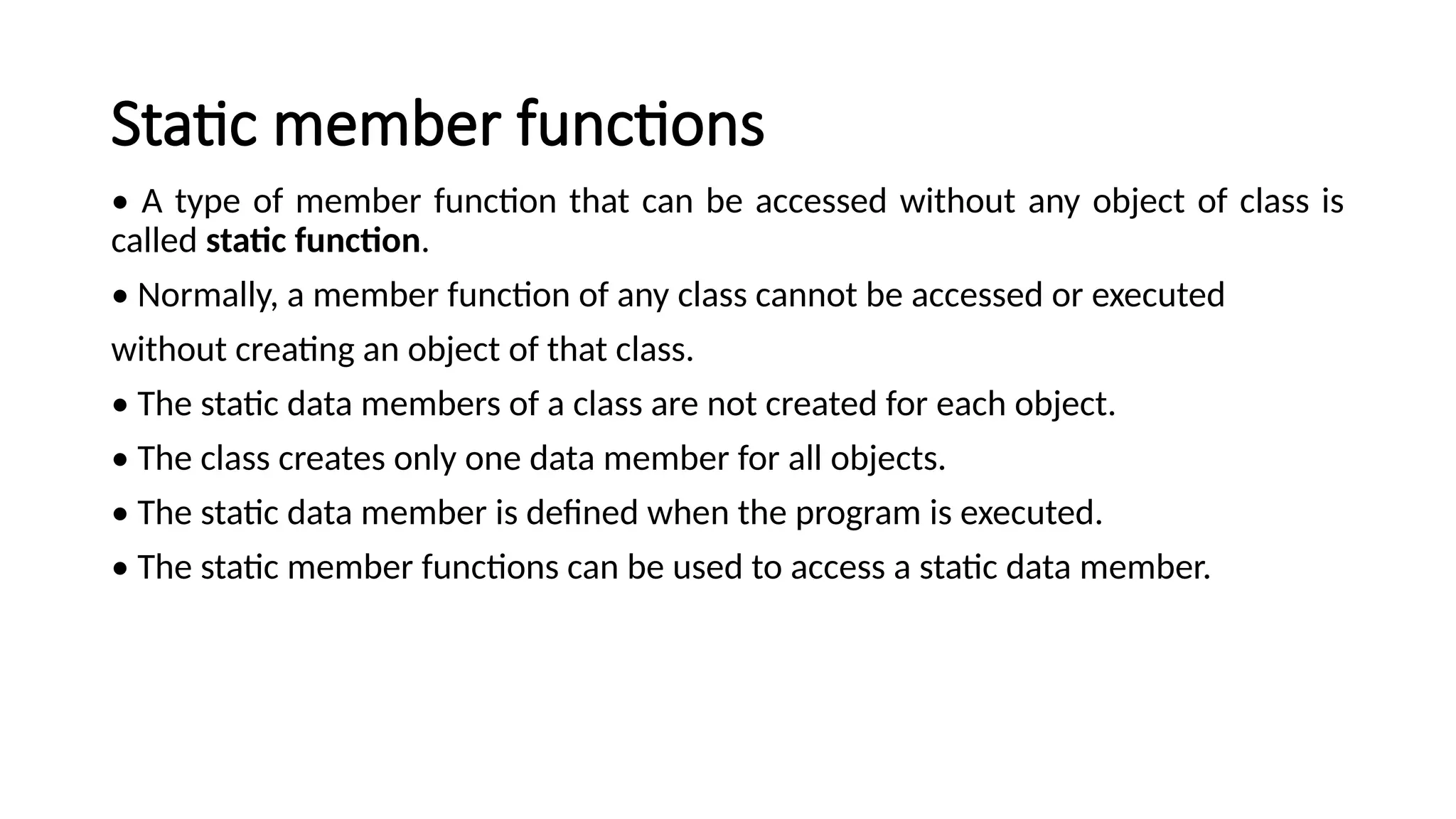 Static member functions •A type of member function that can be accessed without any object of class is called static function. • Normally, a member function of any class cannot be accessed or executed without creating an object of that class. • The static data members of a class are not created for each object. • The class creates only one data member for all objects. • The static data member is defined when the program is executed. • The static member functions can be used to access a static data member.
