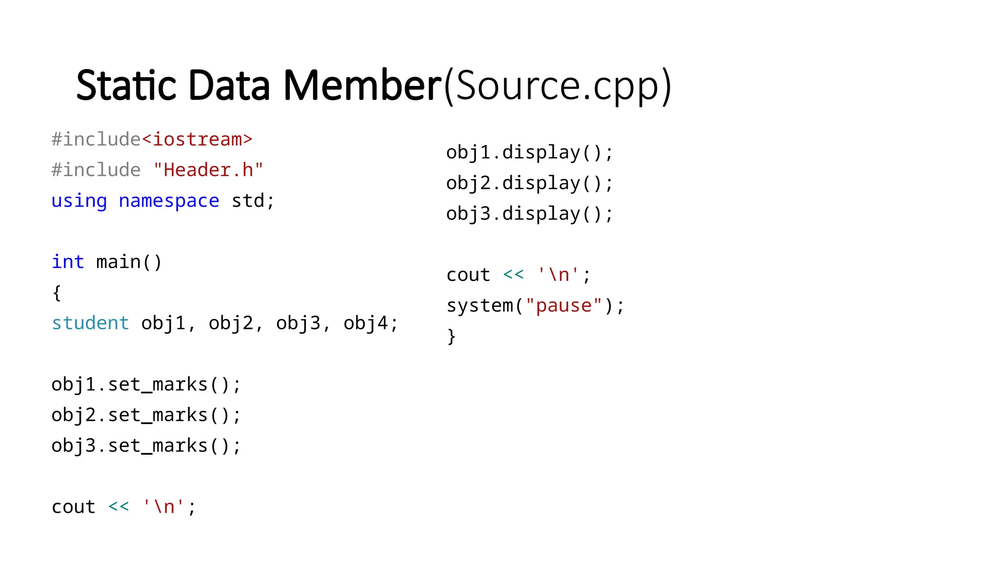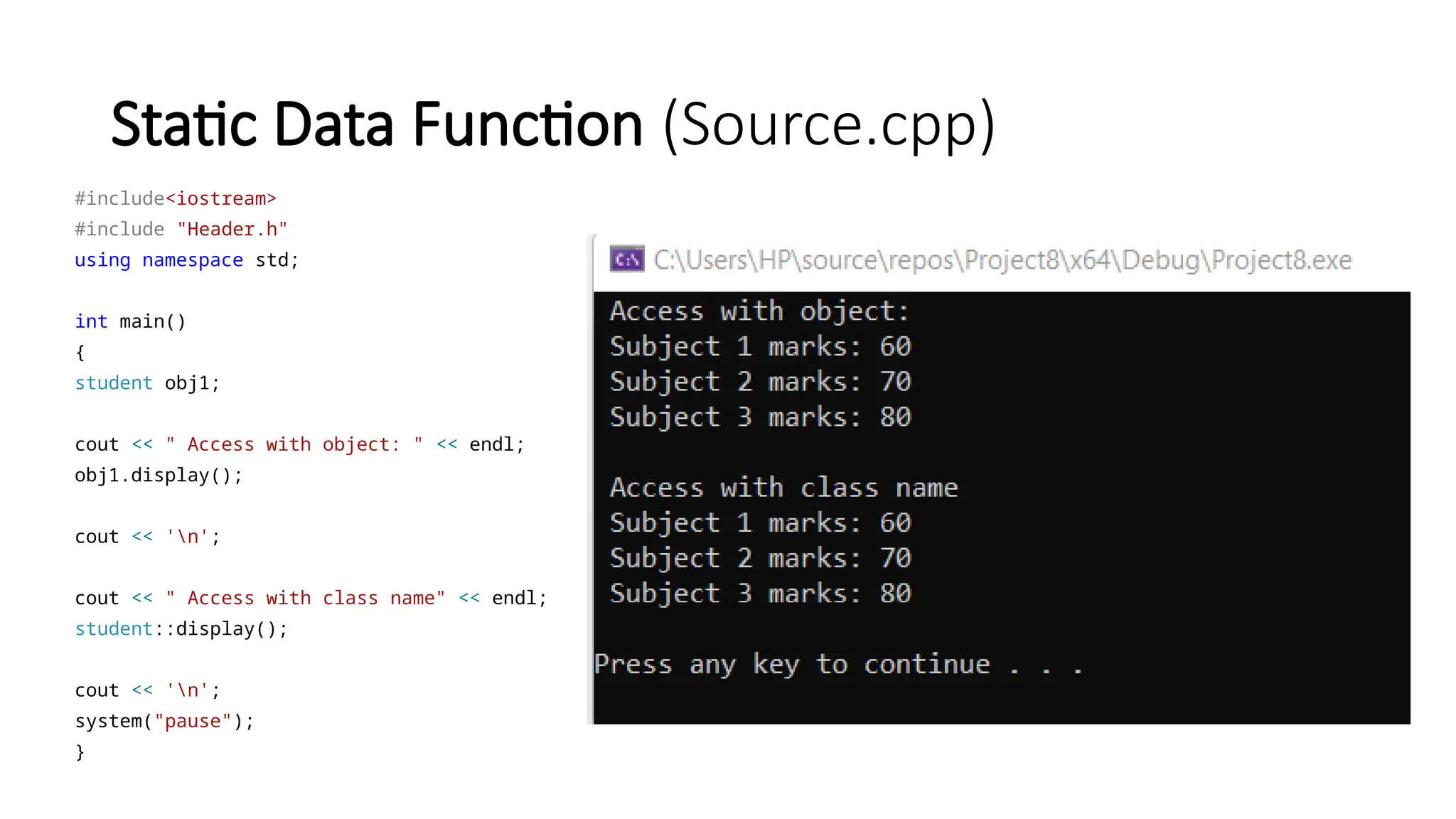 Static Data Function(Source.cpp) #include<iostream> #include "Header.h" using namespace std; int main() { student obj1; cout << " Access with object: " << endl; obj1.display(); cout << 'n'; cout << " Access with class name" << endl; student::display(); cout << 'n'; system("pause"); }