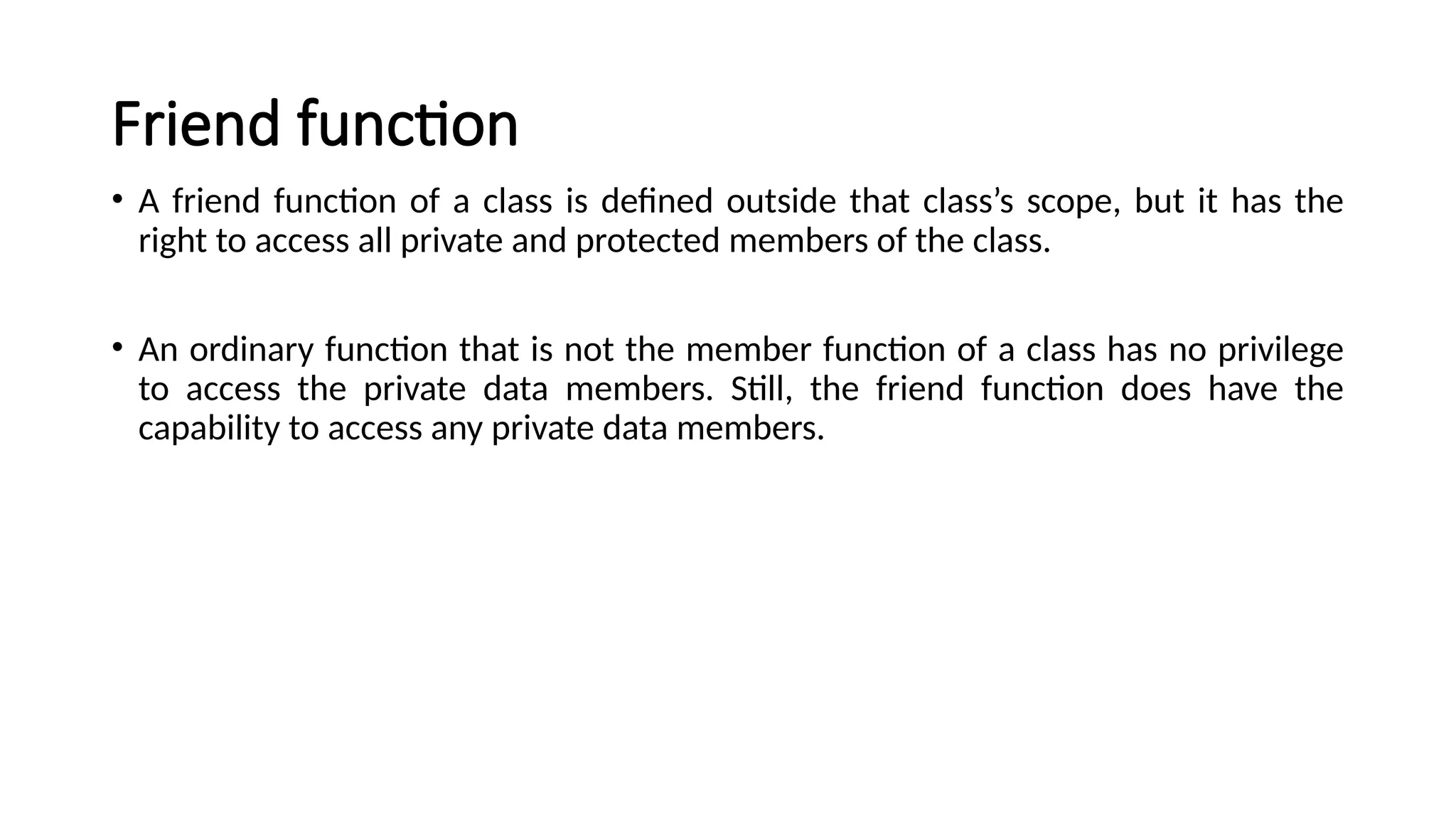 Friend function • Afriend function of a class is defined outside that class’s scope, but it has the right to access all private and protected members of the class. • An ordinary function that is not the member function of a class has no privilege to access the private data members. Still, the friend function does have the capability to access any private data members.