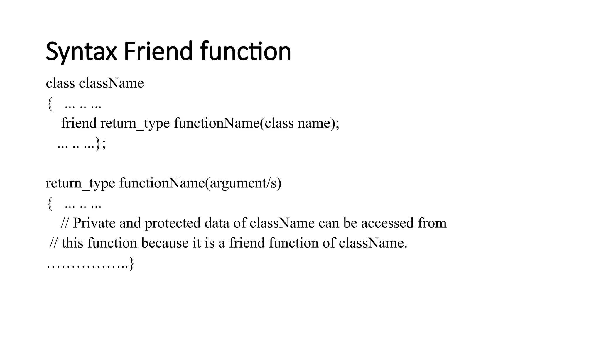 Syntax Friend function classclassName { ... .. ... friend return_type functionName(class name); ... .. ...}; return_type functionName(argument/s) { ... .. ... // Private and protected data of className can be accessed from // this function because it is a friend function of className. ……………..}