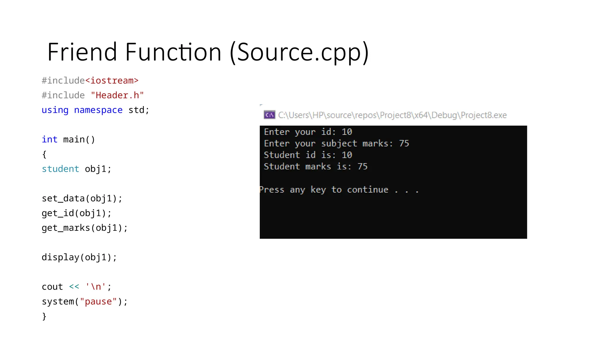Friend Function (Header.h) #pragmaonce #include<iostream> using namespace std; class student { int id; int marks; public: student(); friend void set_data(student& a); friend int get_id(student& b); friend int get_marks(student& c); friend void display(student& d); }; student::student() { id = 0; marks = 0; } void set_data(student &a) { cout << " Enter your id: "; cin >> a.id; cout << " Enter your subject marks: "; cin >> a.marks; } int get_id(student& b) { return b.id; } int get_marks(student &c) { return c.marks; } void display(student& d) { cout << " Student id is: " << d.id << endl; cout << " Student marks is: " << d.marks << endl; }
