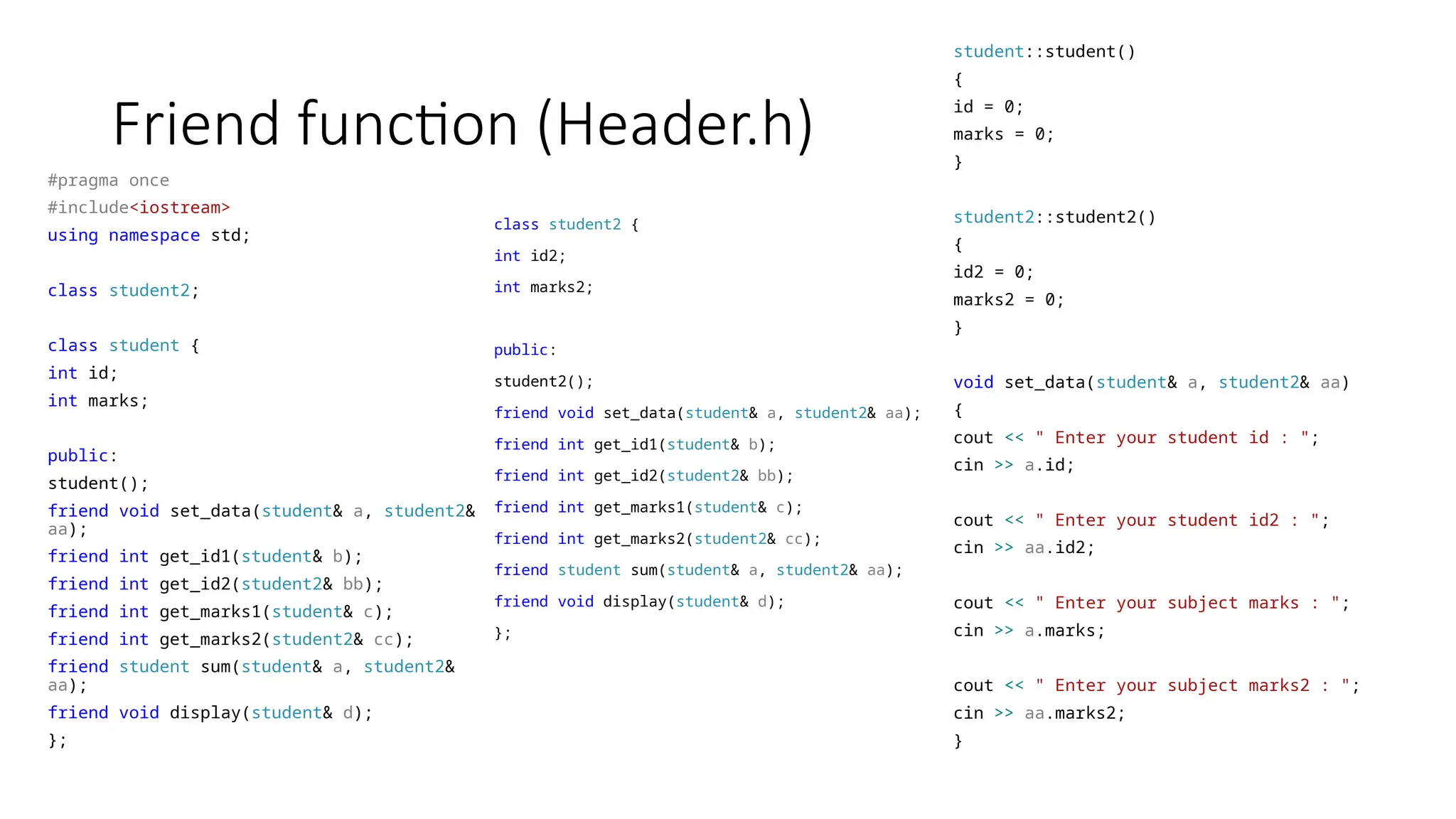 Friend function (Header.h) #pragmaonce #include<iostream> using namespace std; class student2; class student { int id; int marks; public: student(); friend void set_data(student& a, student2& aa); friend int get_id1(student& b); friend int get_id2(student2& bb); friend int get_marks1(student& c); friend int get_marks2(student2& cc); friend student sum(student& a, student2& aa); friend void display(student& d); }; class student2 { int id2; int marks2; public: student2(); friend void set_data(student& a, student2& aa); friend int get_id1(student& b); friend int get_id2(student2& bb); friend int get_marks1(student& c); friend int get_marks2(student2& cc); friend student sum(student& a, student2& aa); friend void display(student& d); }; student::student() { id = 0; marks = 0; } student2::student2() { id2 = 0; marks2 = 0; } void set_data(student& a, student2& aa) { cout << " Enter your student id : "; cin >> a.id; cout << " Enter your student id2 : "; cin >> aa.id2; cout << " Enter your subject marks : "; cin >> a.marks; cout << " Enter your subject marks2 : "; cin >> aa.marks2; }