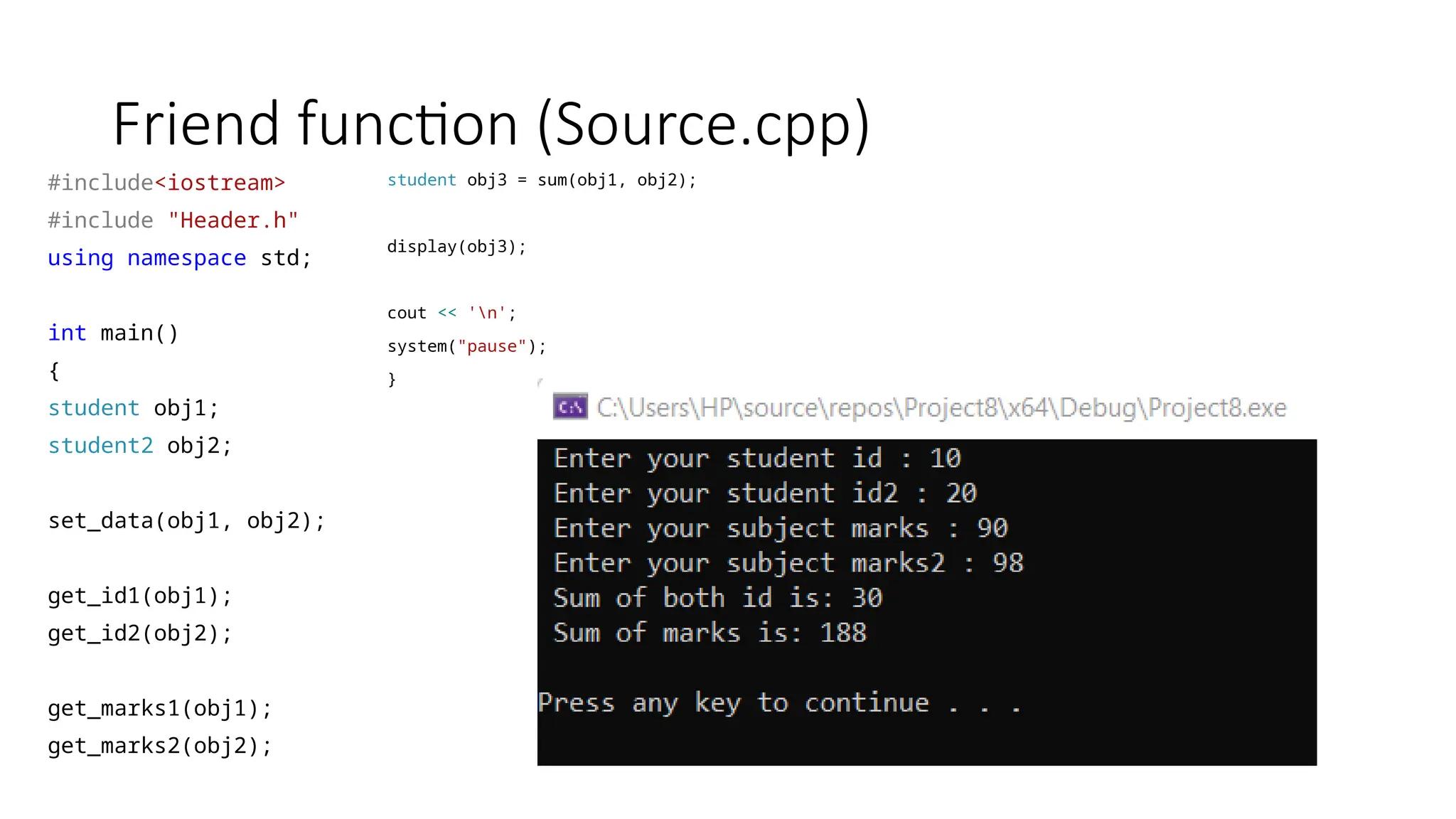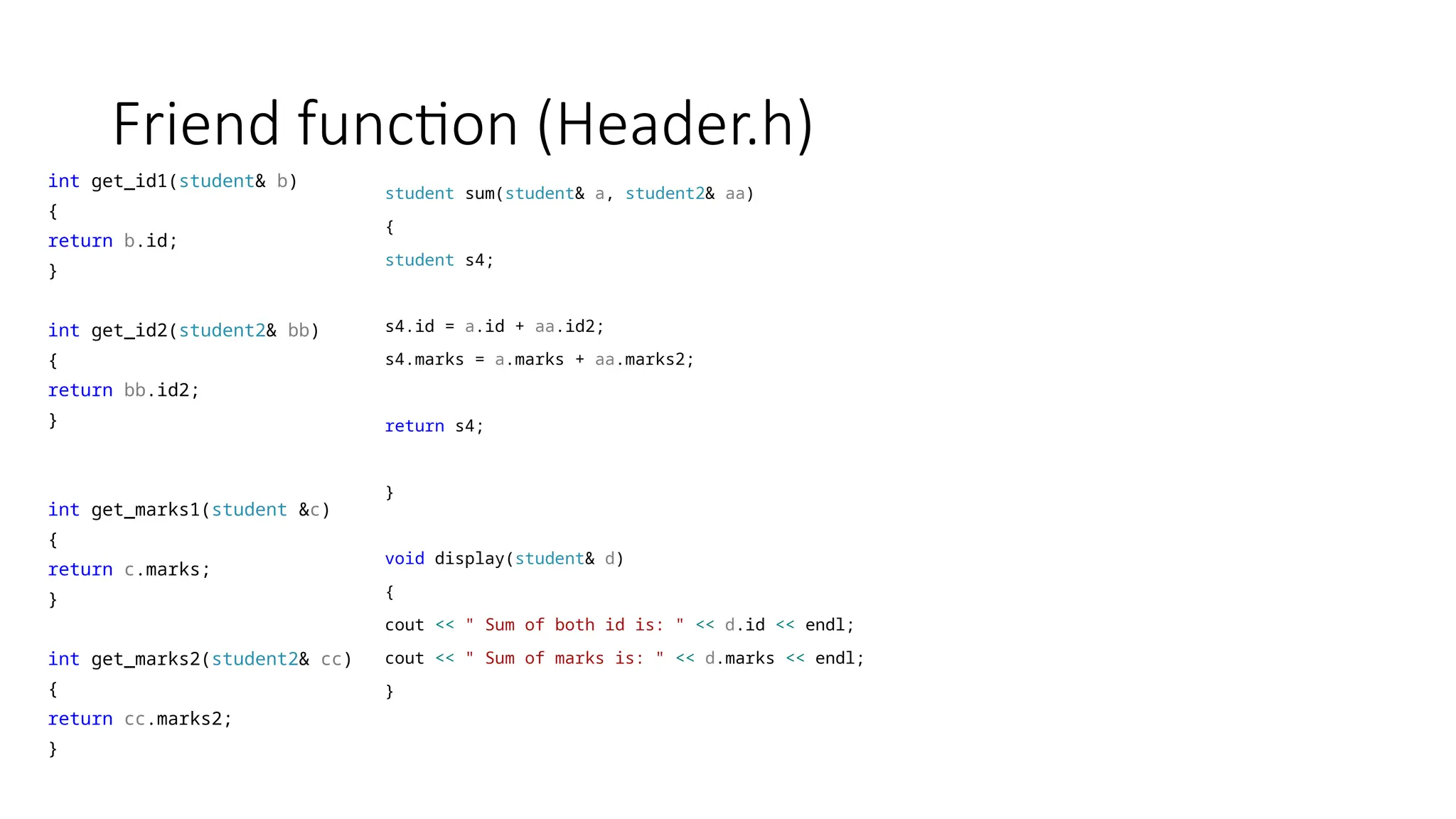 Friend function (Header.h) intget_id1(student& b) { return b.id; } int get_id2(student2& bb) { return bb.id2; } int get_marks1(student &c) { return c.marks; } int get_marks2(student2& cc) { return cc.marks2; } student sum(student& a, student2& aa) { student s4; s4.id = a.id + aa.id2; s4.marks = a.marks + aa.marks2; return s4; } void display(student& d) { cout << " Sum of both id is: " << d.id << endl; cout << " Sum of marks is: " << d.marks << endl; }
