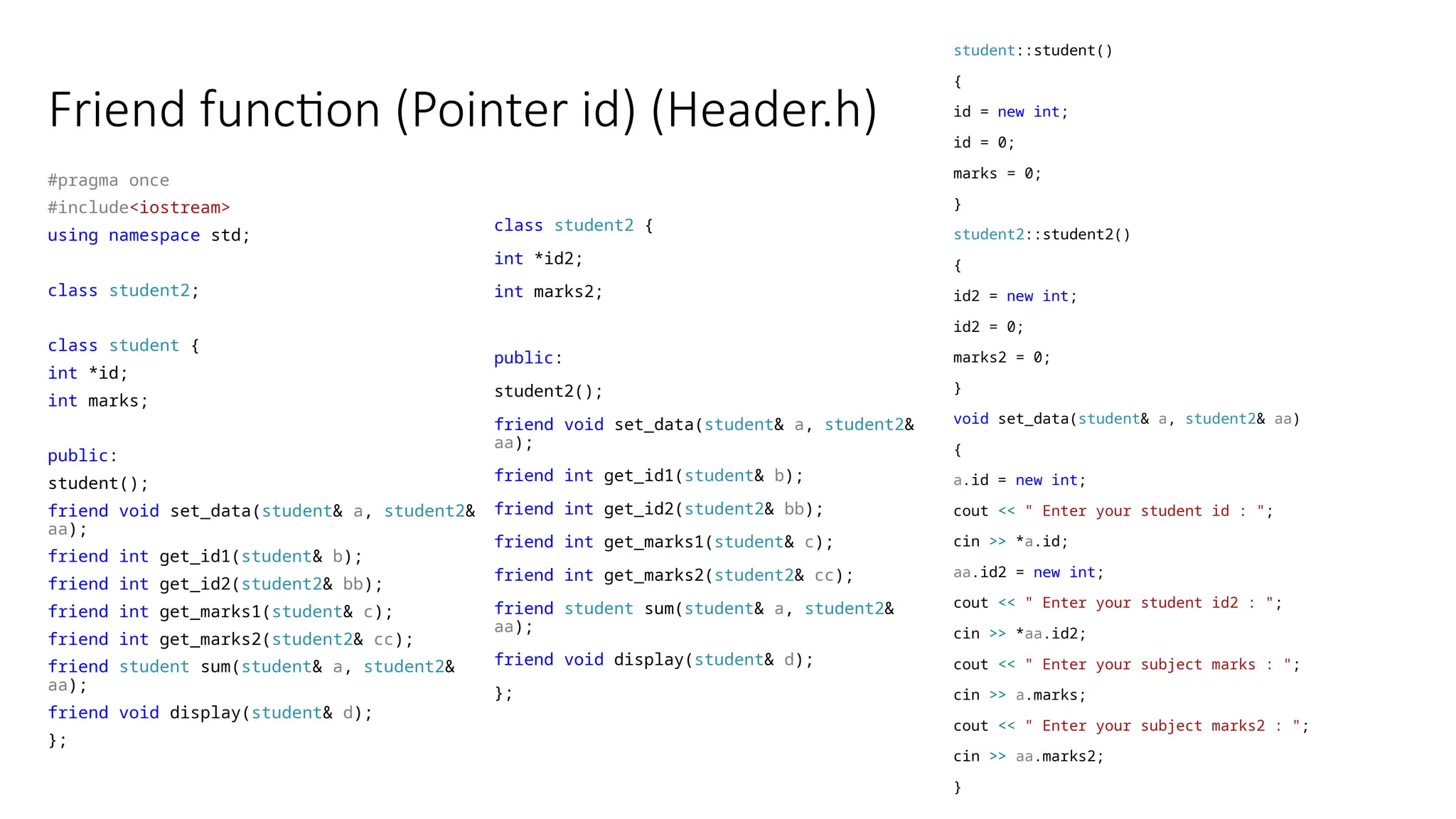 Friend function (Pointerid) (Header.h) #pragma once #include<iostream> using namespace std; class student2; class student { int *id; int marks; public: student(); friend void set_data(student& a, student2& aa); friend int get_id1(student& b); friend int get_id2(student2& bb); friend int get_marks1(student& c); friend int get_marks2(student2& cc); friend student sum(student& a, student2& aa); friend void display(student& d); }; class student2 { int *id2; int marks2; public: student2(); friend void set_data(student& a, student2& aa); friend int get_id1(student& b); friend int get_id2(student2& bb); friend int get_marks1(student& c); friend int get_marks2(student2& cc); friend student sum(student& a, student2& aa); friend void display(student& d); }; student::student() { id = new int; id = 0; marks = 0; } student2::student2() { id2 = new int; id2 = 0; marks2 = 0; } void set_data(student& a, student2& aa) { a.id = new int; cout << " Enter your student id : "; cin >> *a.id; aa.id2 = new int; cout << " Enter your student id2 : "; cin >> *aa.id2; cout << " Enter your subject marks : "; cin >> a.marks; cout << " Enter your subject marks2 : "; cin >> aa.marks2; }