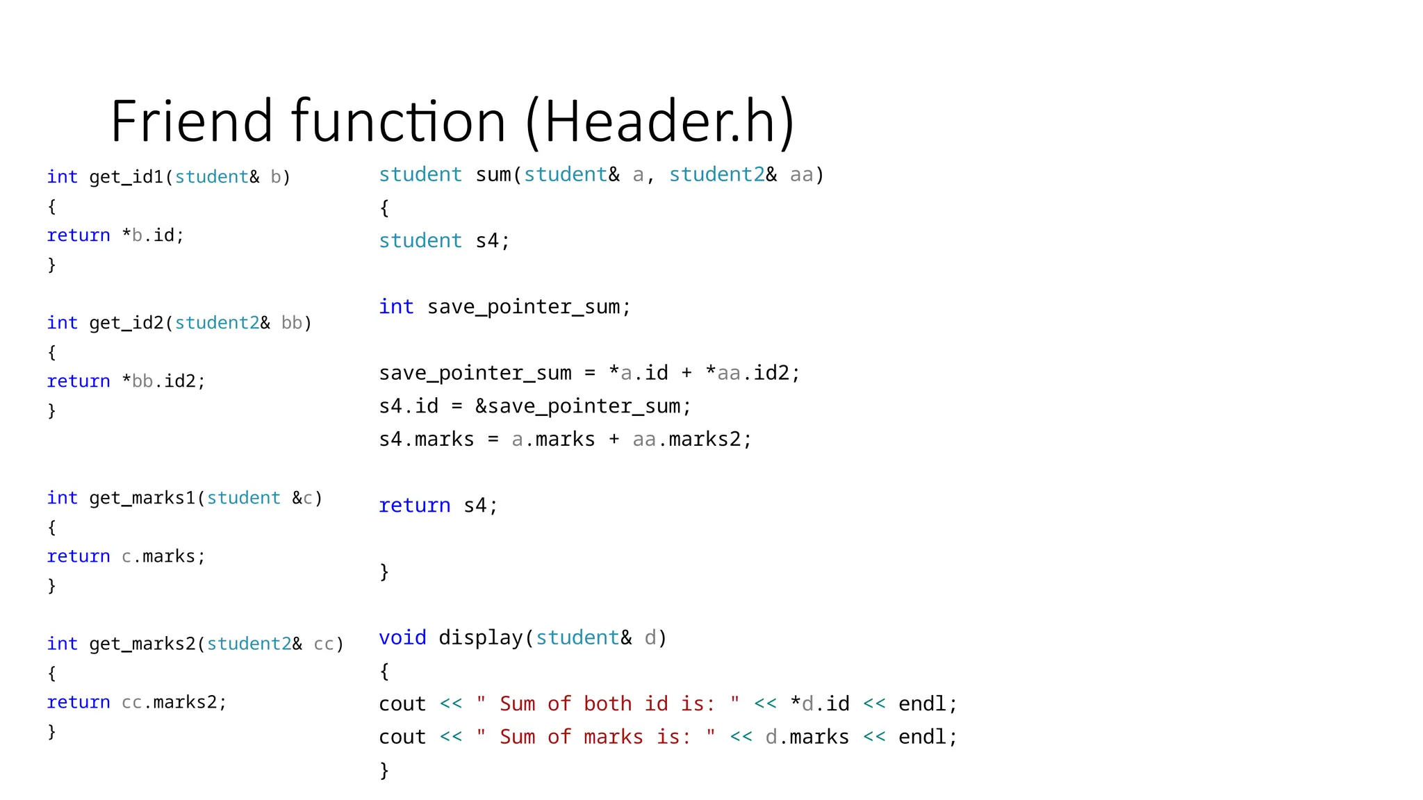 Friend function (Header.h) intget_id1(student& b) { return *b.id; } int get_id2(student2& bb) { return *bb.id2; } int get_marks1(student &c) { return c.marks; } int get_marks2(student2& cc) { return cc.marks2; } student sum(student& a, student2& aa) { student s4; int save_pointer_sum; save_pointer_sum = *a.id + *aa.id2; s4.id = &save_pointer_sum; s4.marks = a.marks + aa.marks2; return s4; } void display(student& d) { cout << " Sum of both id is: " << *d.id << endl; cout << " Sum of marks is: " << d.marks << endl; }