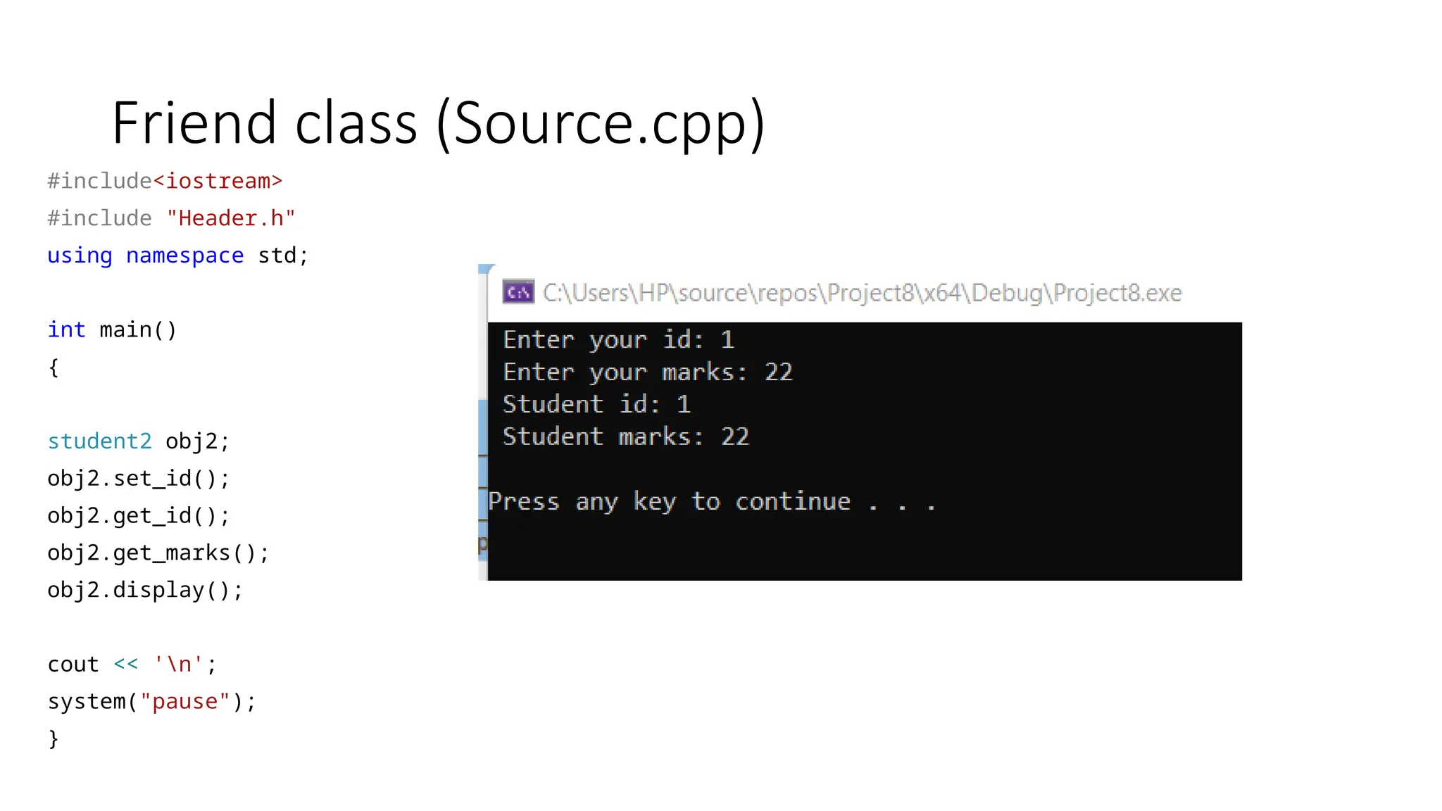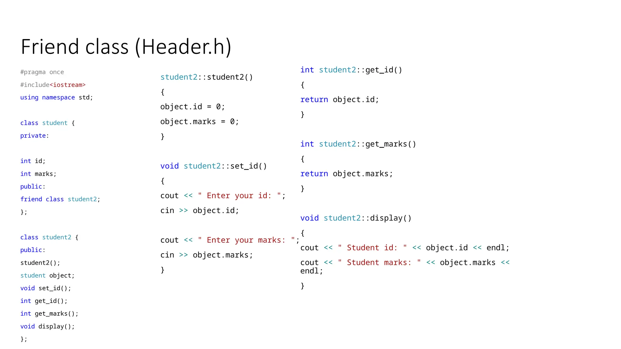 Friend class (Header.h) #pragmaonce #include<iostream> using namespace std; class student { private: int id; int marks; public: friend class student2; }; class student2 { public: student2(); student object; void set_id(); int get_id(); int get_marks(); void display(); }; student2::student2() { object.id = 0; object.marks = 0; } void student2::set_id() { cout << " Enter your id: "; cin >> object.id; cout << " Enter your marks: "; cin >> object.marks; } int student2::get_id() { return object.id; } int student2::get_marks() { return object.marks; } void student2::display() { cout << " Student id: " << object.id << endl; cout << " Student marks: " << object.marks << endl; }