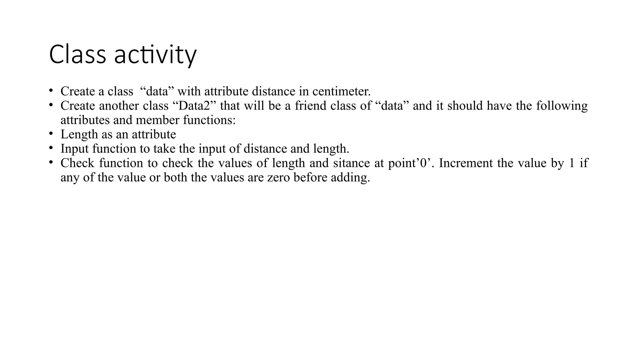 Class activity • Createa class “data” with attribute distance in centimeter. • Create another class “Data2” that will be a friend class of “data” and it should have the following attributes and member functions: • Length as an attribute • Input function to take the input of distance and length. • Check function to check the values of length and sitance at point’0’. Increment the value by 1 if any of the value or both the values are zero before adding.