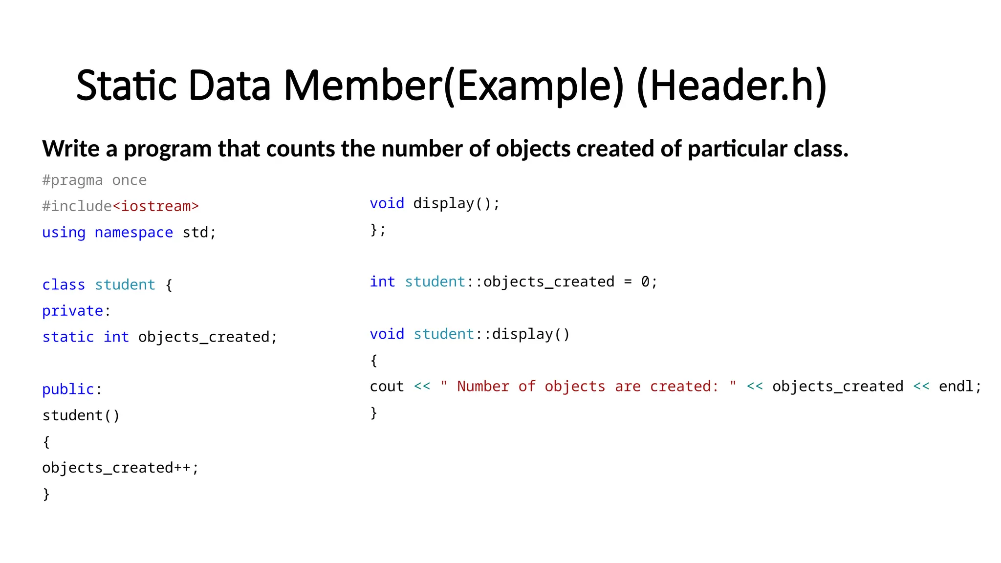 Static Data Member(Example)(Header.h) Write a program that counts the number of objects created of particular class. #pragma once #include<iostream> using namespace std; class student { private: static int objects_created; public: student() { objects_created++; } void display(); }; int student::objects_created = 0; void student::display() { cout << " Number of objects are created: " << objects_created << endl; }