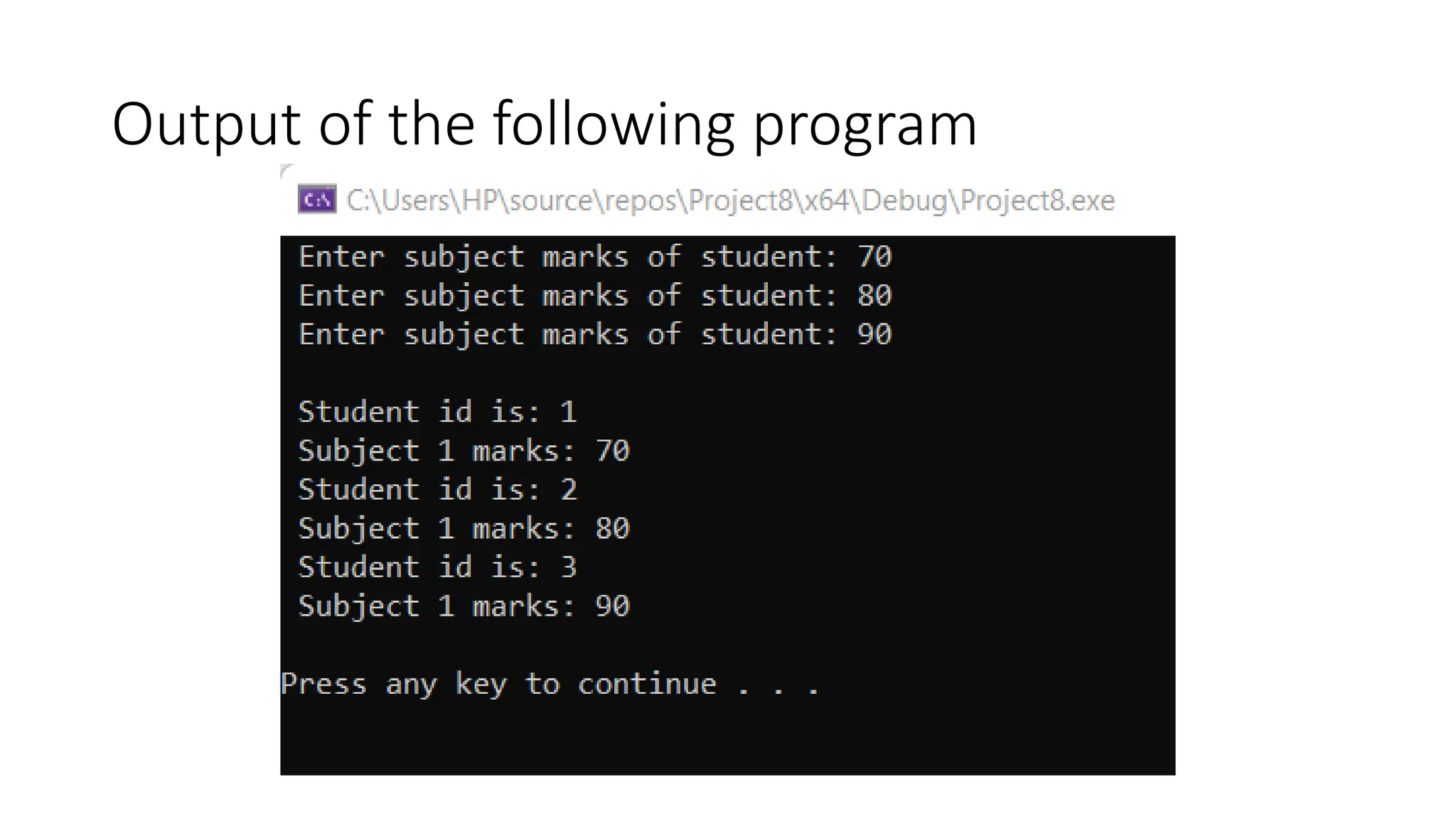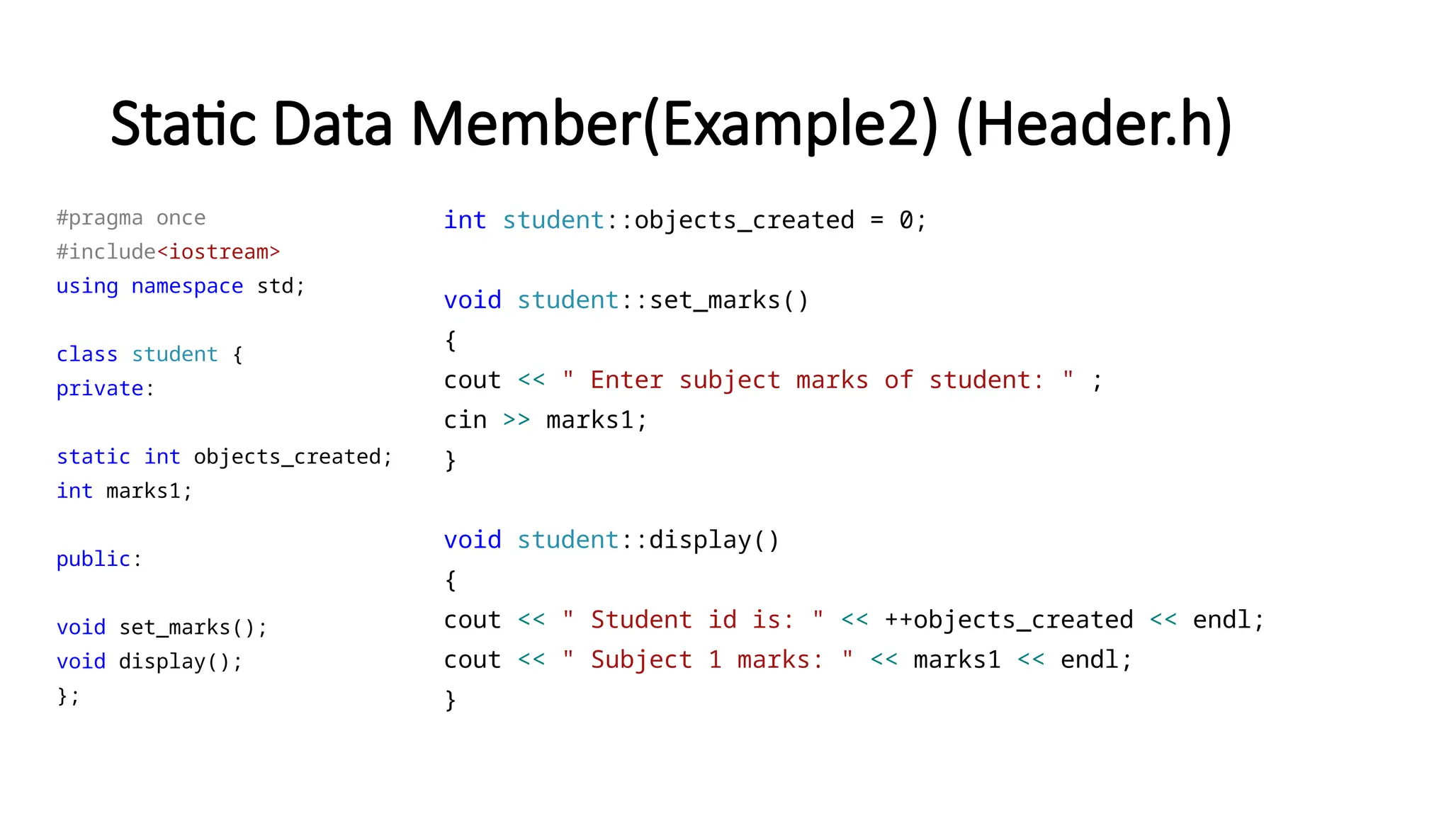 Static Member Function(Header.h) #pragma once #include<iostream> using namespace std; class student { private: static int marks1; static int marks2; static int marks3; public: static void display(); }; int student::marks1 = 60; int student::marks2 = 70; int student::marks3 = 80; void student::display() { cout << " Subject 1 marks: " << marks1 << endl; cout << " Subject 2 marks: " << marks2 << endl; cout << " Subject 3 marks: " << marks3 << endl; }