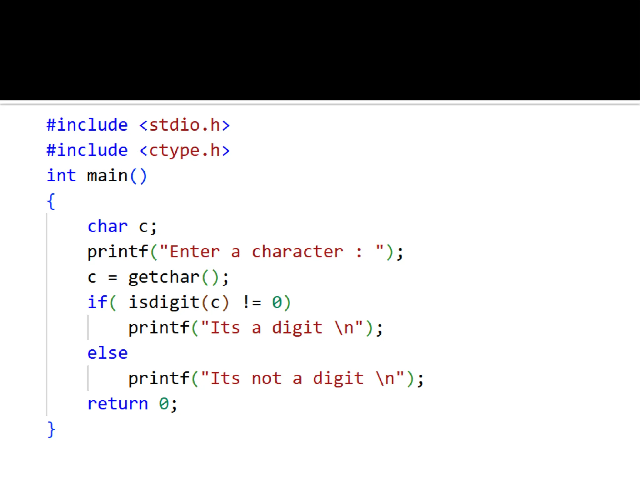 Useful Character-handling library functions. PrototypeFunction Description int isdigit( int c ); Returns a non-zero value if c is a digit and 0 (false) otherwise. int isalpha( int c ); Returns a non-zero value if c is a letter and 0 otherwise. int isalnum( int c ); Returns a non-zero value if c is a digit or a letter and 0 otherwise. int isxdigit( int c ); Returns a non-zero value if c is a hexadecimal digit character and 0 otherwise. int islower( int c ); Returns a non-zero value if c is a lowercase letter and 0 otherwise. int isupper( int c ); Returns a non-zero value if c is an uppercase letter and 0 other wise. int tolower( int c ); If c is an uppercase letter, tolower returns c as a lowercase letter. Otherwise, tolower returns the argument unchanged. int toupper( int c ); If c is a lowercase letter, toupper returns c as an uppercase letter. Otherwise, toupper returns the argument unchanged. Include ctype.h when using these functions