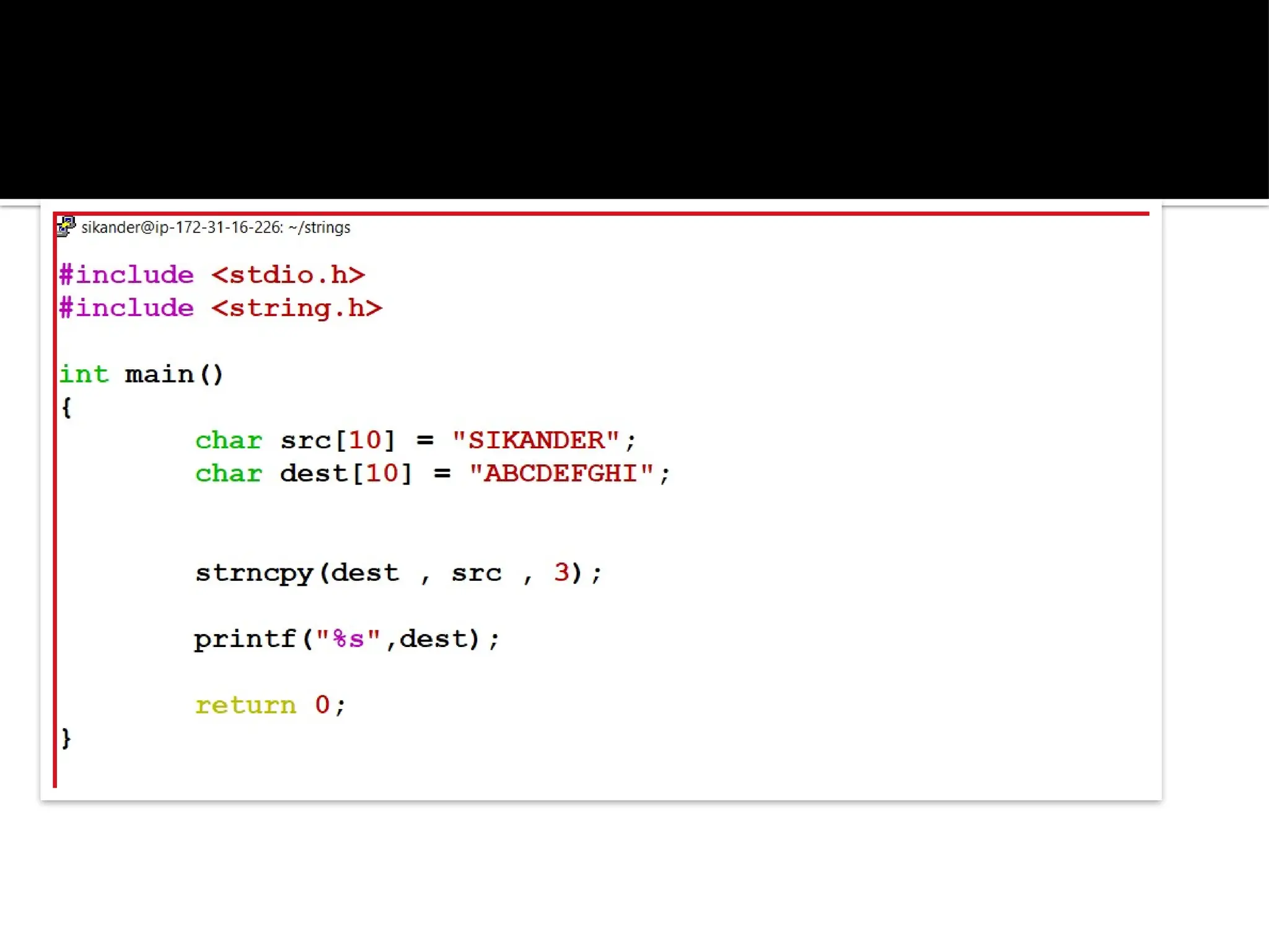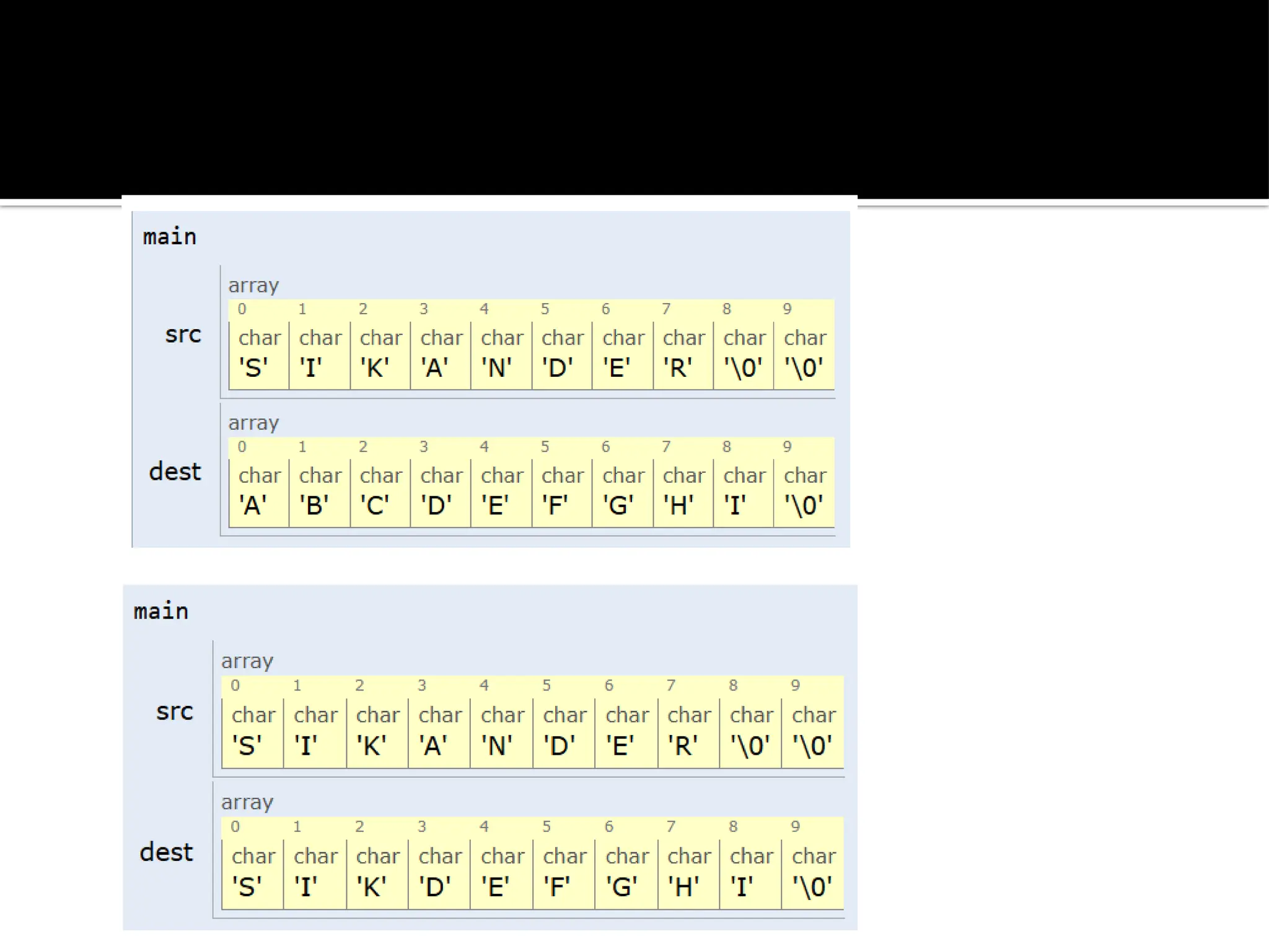 strcpy – copya String char *strcpy(char *dest, const char *src); The strcpy() function copies the string pointed to by src, including the terminating null byte ('0'), to the buffer pointed to by dest. The destination string dest must be large enough to receive the copy. Programming with Sikander | C Programming | Strings