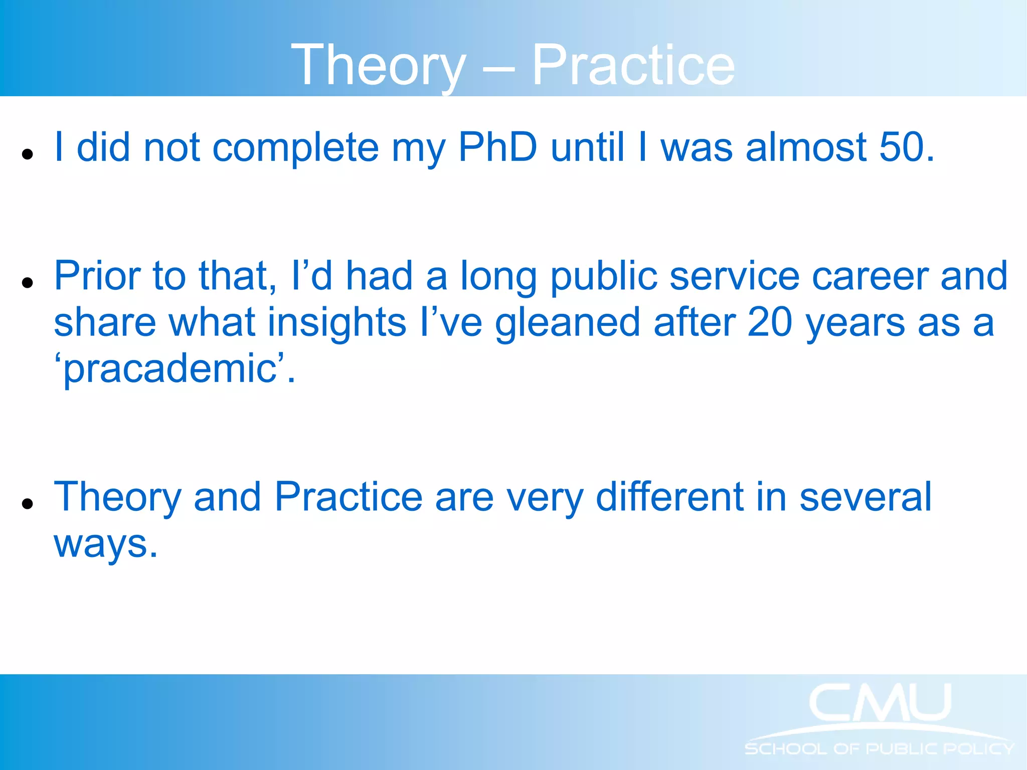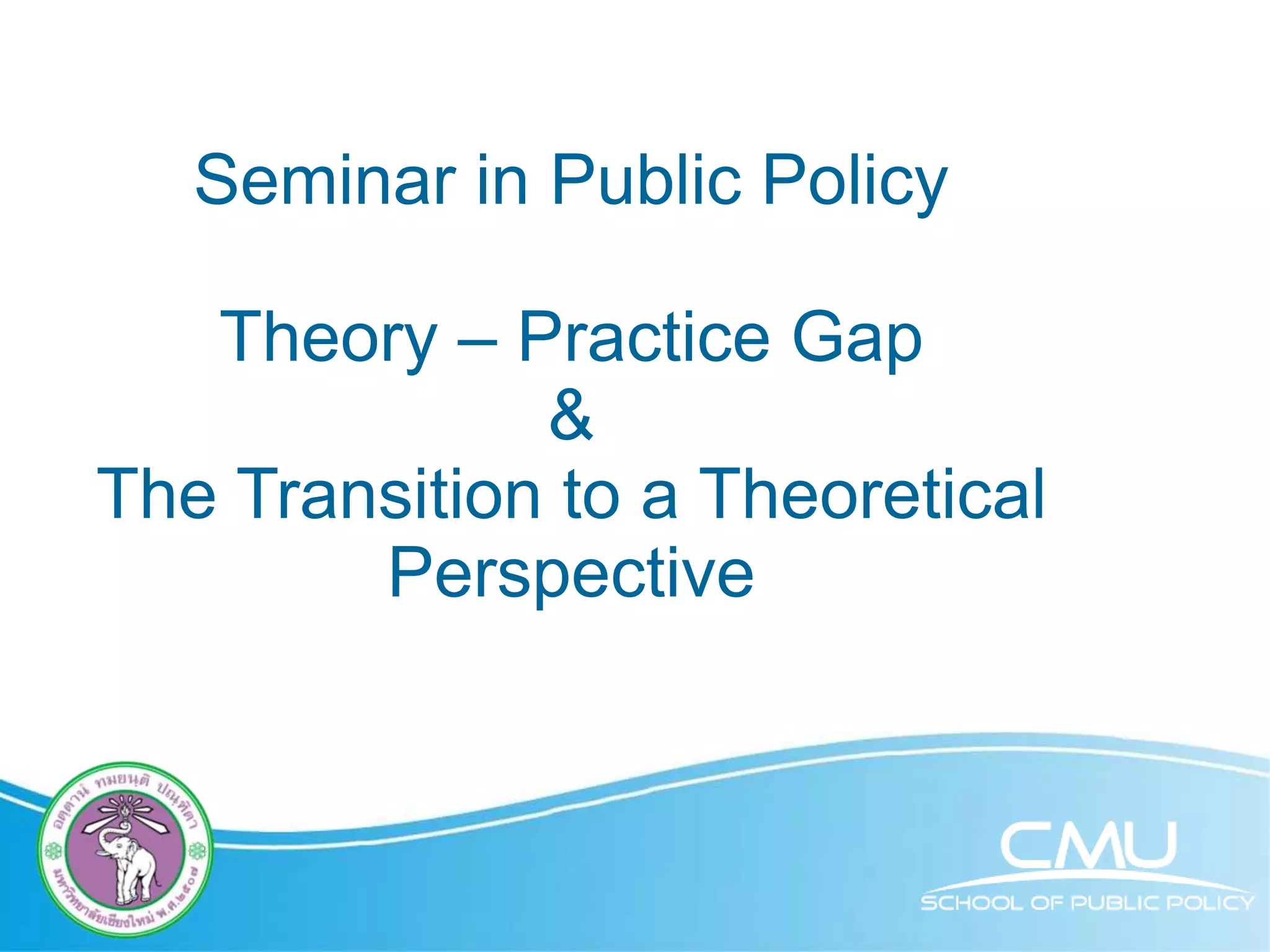 The document discusses the gap between theory and practice in public policy, drawing from the author's extensive experience as a 'pracademic'. It highlights the distinctions between practical experience, which is often narrow and situation-specific, and theoretical knowledge, which seeks generalizable principles. The transition from practice to theory is emphasized as a way to enhance effectiveness by integrating theoretical insights with practical experience.