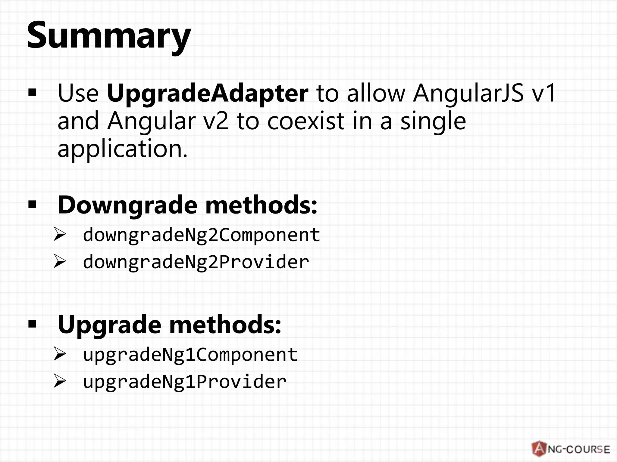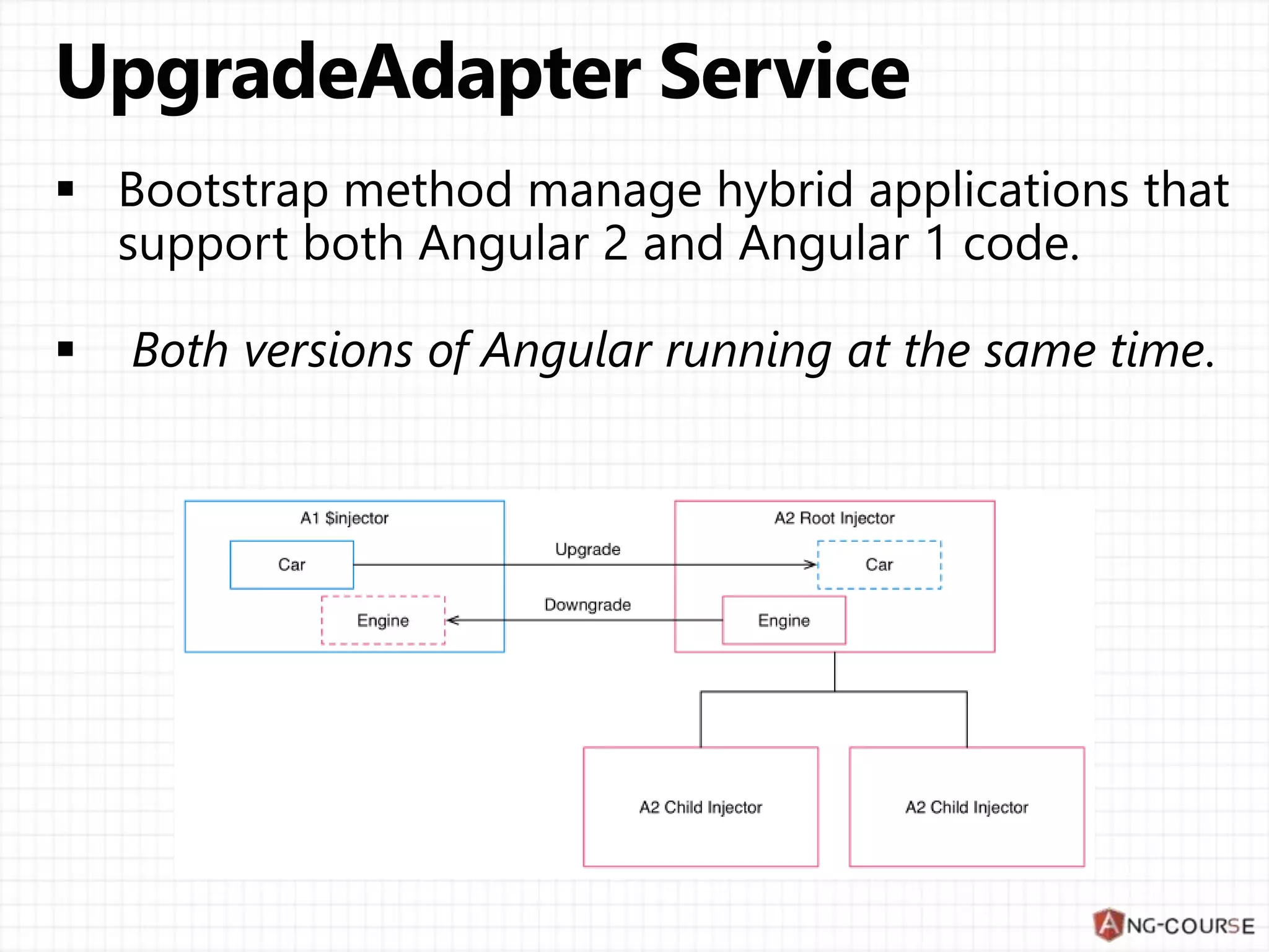 The document outlines the process of integrating AngularJS with Angular by using the upgrade adapter to bootstrap applications and manage components between AngularJS and Angular. It details the creation of an AngularJS module called 'heroapp', along with directives and components that facilitate the usage of Angular features in an AngularJS environment. Key concepts include various types of data binding and the use of services and factories to maintain state across the frameworks.