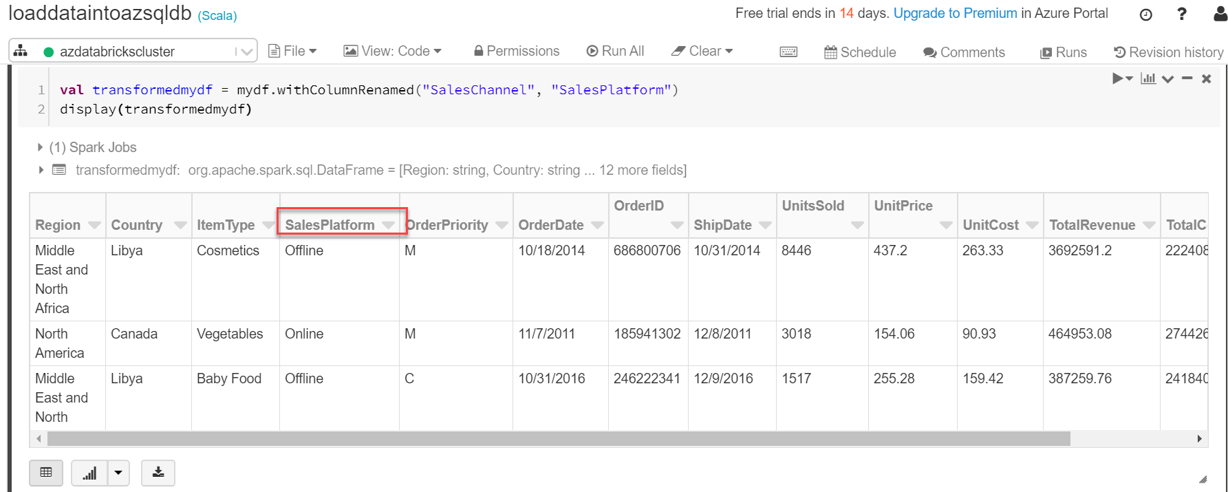 1 2 | val transformedmydf = mydf.withColumnRenamed("SalesChannel", "SalesPlatform") display(transformedmydf) |