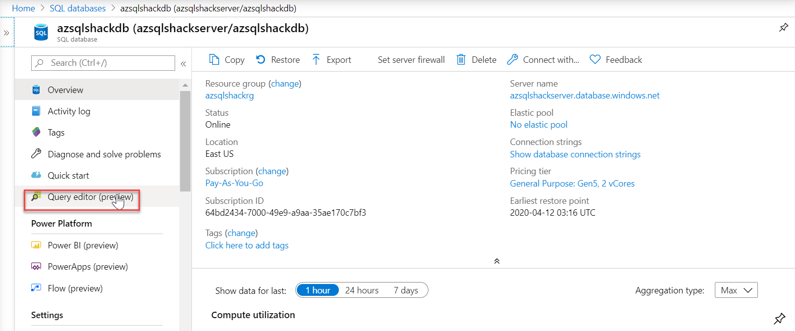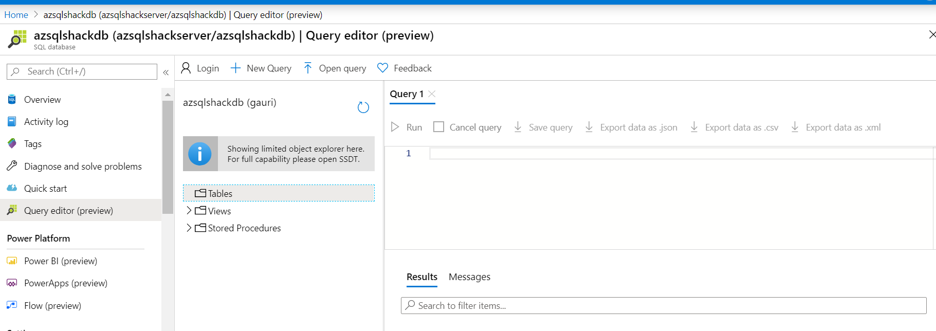 Before we load the transformed data into the Azure SQL Database, let’s quickly take a peek at the database on the Azure portal. For this go to the portal, and select the SQL database, click on the Query editor (preview),