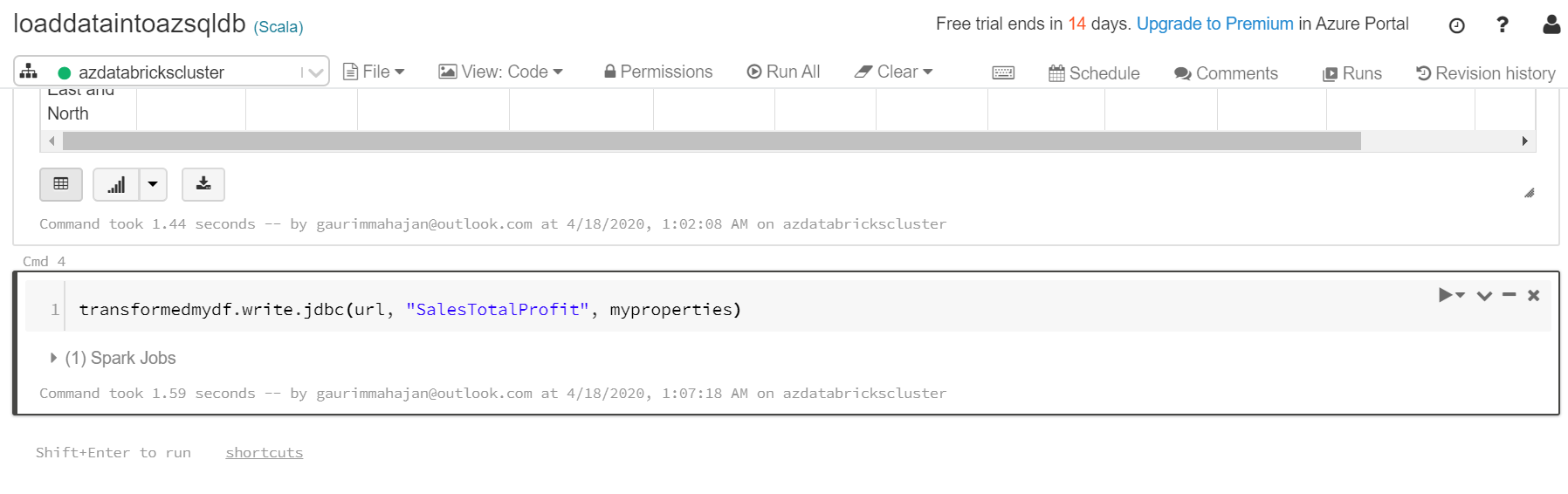 On the Azure Databricks portal, execute the below code. This will load the CSV file into a table named SalesTotalProfit in the SQL Database on Azure.
