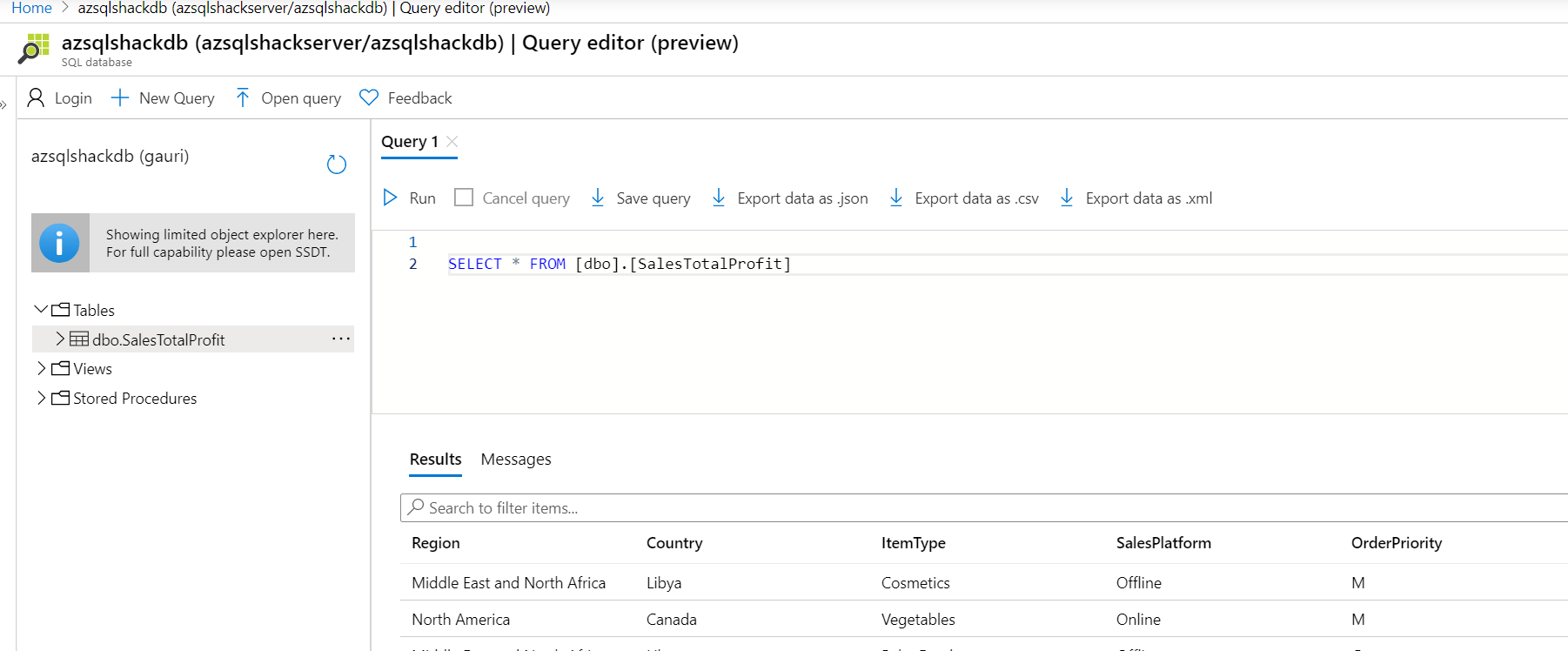 The data is loaded into the table, SalesTotalProfit in the database, azsqlshackdb on Azure. And you can perform any operations on the data, as you would do in any regular database.