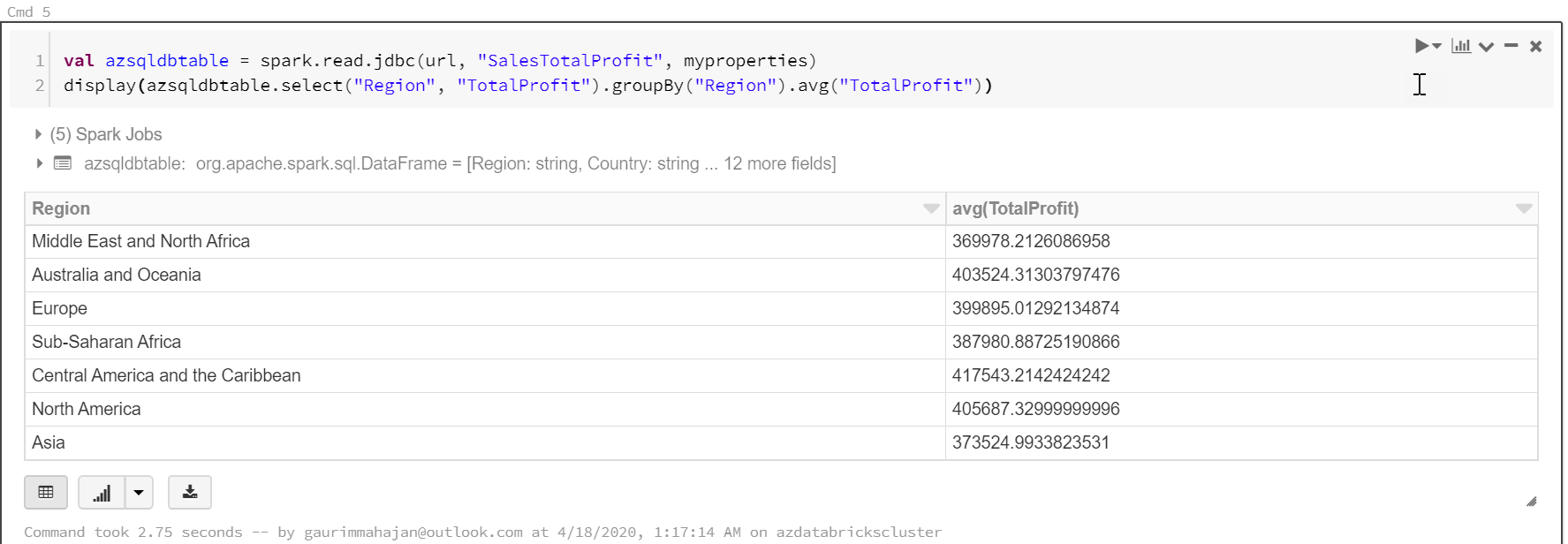 1 2 | val azsqldbtable = spark.read.jdbc(url, "SalesTotalProfit", myproperties) display(azsqldbtable.select("Region", "TotalProfit").groupBy("Region").avg("TotalProfit") |