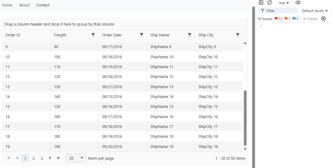 //_Layout.cshtml <head> <meta charset="utf-8" /> <meta name="viewport" content="width=device-width, initial-scale=1.0" /> <meta http-equiv="Content-Security-Policy" content="default-src 'self'; img-src 'self' data:; script-src 'self' https://kendo.cdn.telerik.com https://code.jquery.com/ https://cdn.kendostatic.com https://unpkg.com https://cdn.jsdelivr.net; style-src 'self' https://kendo.cdn.telerik.com https://unpkg.com https://cdn.jsdelivr.net; font-src 'self' https://unpkg.com; connect-src ws: http: 'self';" /> <link href="https://kendo.cdn.telerik.com/themes/11.3.2/default/default-ocean-blue.css" rel="stylesheet" type="text/css" /> <script src="https://code.jquery.com/jquery-3.7.1.min.js"></script> <script src="https://unpkg.com/jszip/dist/jszip.min.js"></script> <script src="https://cdn.kendostatic.com/2025.3.812/js/kendo.all.min.js"></script> <script src="https://cdn.kendostatic.com/2025.3.812/js/kendo.aspnetmvc.min.js"></script> </head> <body class="k-content"> ... @(Html.Kendo().DeferredScriptFile()) </body> //Index.cshtml @(Html.Kendo().Grid<TelerikAspNetCoreApp142.Models.OrderViewModel>() .Name("grid") .Columns(columns => { columns.Bound(p => p.OrderID).Filterable(false); columns.Bound(p => p.Freight); columns.Bound(p => p.OrderDate).Format("{0:MM/dd/yyyy}"); columns.Bound(p => p.ShipName); columns.Bound(p => p.ShipCity); }) .Pageable(p => p .PageSizes(new int[] { 5, 10, 25, 50, 100 })) .Sortable() .Scrollable() .Groupable() .Filterable() .DataSource(dataSource => dataSource .Ajax() .PageSize(20) .Read(read => read.Action("Orders_Read", "Grid")) ) )
