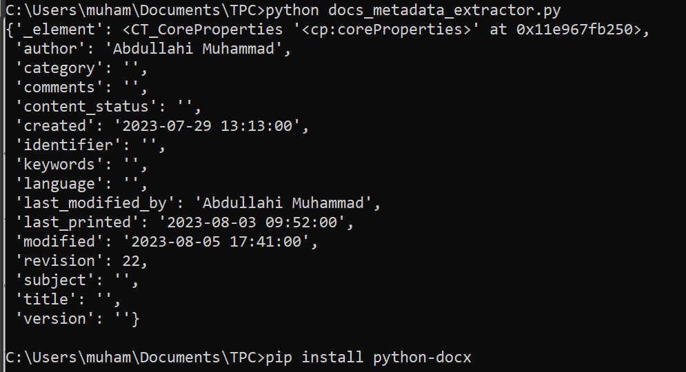 docx_path = 'test1.docx' # Path to the Word document file. metadata = extract_metadata(docx_path) # Call the extract_metadata function. pprint(metadata) # Pretty print the metadata dictionary.