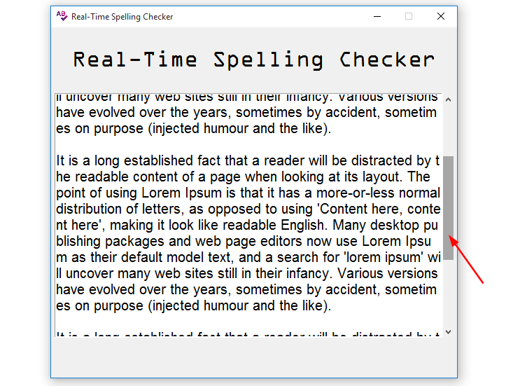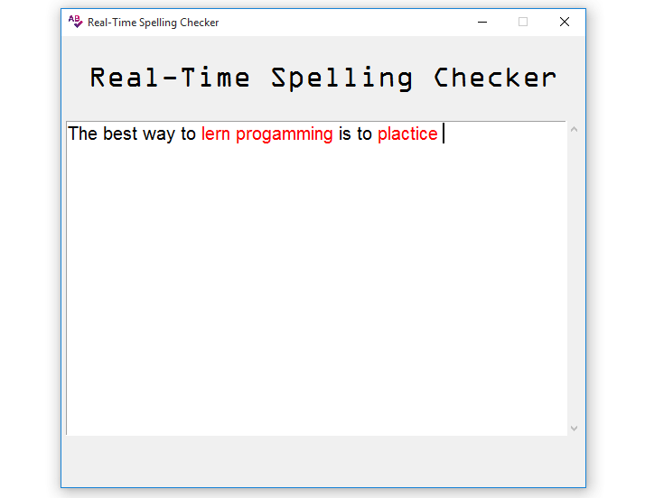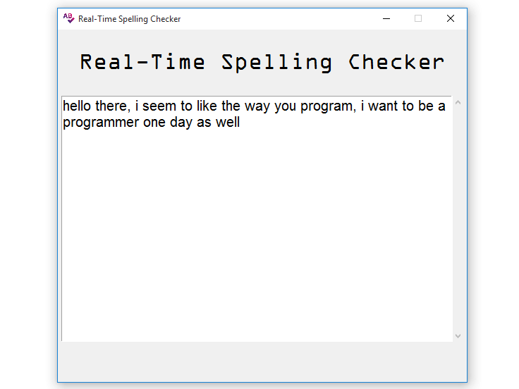 ScrolledText via the get() function, 1.0 is the starting point of the characters while END is the end point of the characters.content.count(' ')if statement that checks if the space_count is not equal to self.old_spaces, if that is True, we update self.old_spaces to space_count.for loop inside the if statement loops through all the tag names and removes them from the attached word if it is having the correct spelling.for loop, we are splitting the contents of the ScrolledText via content.split(' '), then we loop through the split contents and access a single word.if statement for checking the validity of the word, we have the re.sub() function that gets all the special characters and replaces them with an empty string on the lower-cased word.content.find() function and we are adding to it from its first to last charactertag_config() function which takes the word and foreground as arguments.Now we are set to test the application, let us run the program and type a sentence with some misspelled words, this is the output that we will get: