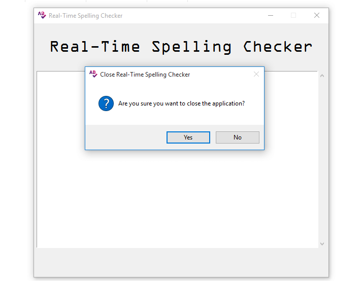 # the function for closing the application def close(self): # this will ask the user whether to close or not # if the value is yes/True the window will close if askyesno(title='Close Real-Time Spelling Checker', message='Are you sure you want to close the application?'): # this destroys the window self.master.destroy() This is what is happening in the code, we have a function called close() taking self as an argument. We have the askyesno message box, which evaluates into two boolean values True or False.