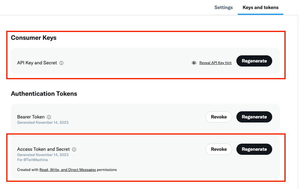 Then, navigate to your App's keys and tokens tab and generate new pairs if you don't have them yet or generate new ones if you misplaced your existing tokens. We don't need the Bearer Token for this tutorial: