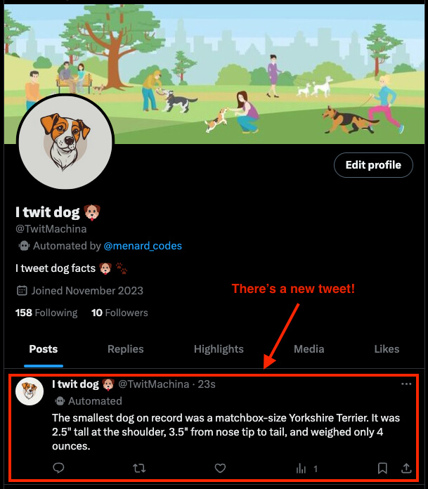 In this tutorial, we will build a Twitter bot that automatically tweets for us. This bot will tweet random dog facts every hour. The dog facts will come from this API endpoint.
