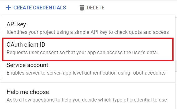 Click on Create Credentials, and then choose OAuth client ID from the dropdown menu:
