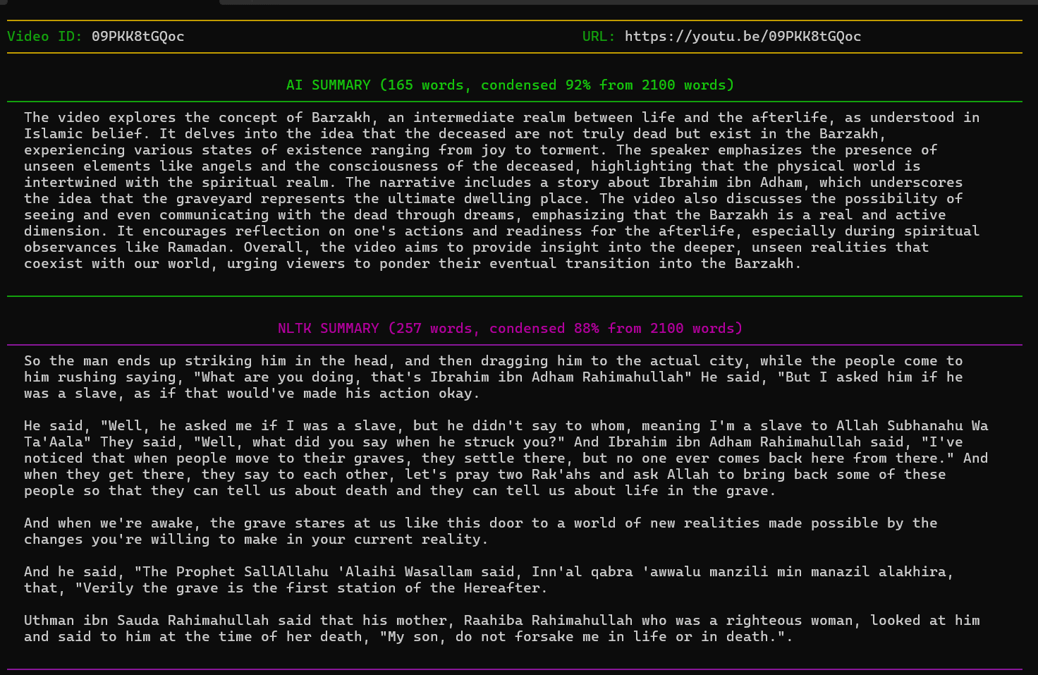 function displays the final summary result in a structured format. It prints a header with the video title, metadata, and the summarized transcript (for both “AI” and NLTK) with appropriate formatting and spacing. If an error occurs, it prints an error message in a red box.