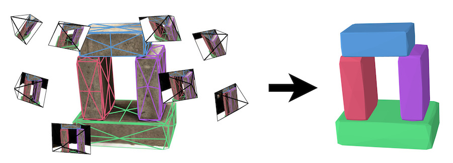 We compute a primitive-based 3D reconstruction from multiple views by optimizing textured superquadric meshes with learnable transparency.