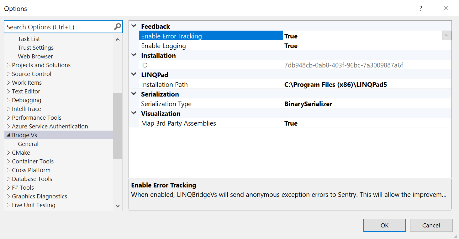 This feature can be turned on or off at any time through the option menu: Tools->Options->BridgeVs->ErrorTracking. See the BridgeVs Option Menu section for more details.