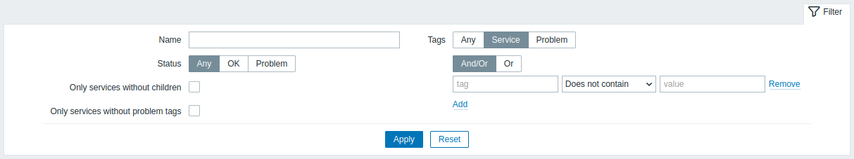 | Tags | Filtrar pelo nome e valor da tag do serviço, ou pelo nome e valor da tag de problema do serviço (no modo de edição de serviços). É possível incluir ou excluir tags e valores de tags específicos. Várias condições podem ser definidas. A correspondência do nome da tag diferencia maiúsculas de minúsculas. Existem vários operadores disponíveis para cada condição: Existe - inclui os nomes de tags especificados; Igual - inclui os nomes e valores de tags especificados (diferencia maiúsculas de minúsculas); Contém - inclui os nomes de tags especificados onde os valores das tags contêm a string inserida (correspondência de substring, não diferencia maiúsculas de minúsculas); Não existe - exclui os nomes de tags especificados; Não é igual - exclui os nomes e valores de tags especificados (diferencia maiúsculas de minúsculas); Não contém - exclui os nomes de tags especificados onde os valores das tags contêm a string inserida (correspondência de substring, não diferencia maiúsculas de minúsculas). Existem dois tipos de cálculo para as condições: E/Ou - todas as condições devem ser atendidas, condições com o mesmo nome de tag serão agrupadas pela condição Ou; Ou - basta que uma condição seja atendida. |