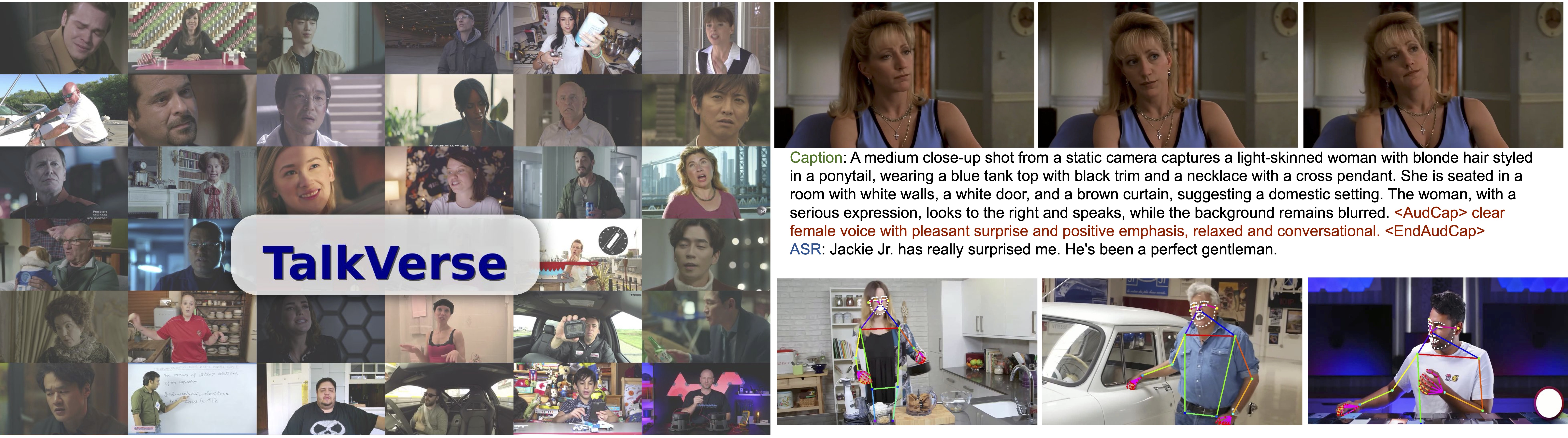 TalkVerse is a large-scale, open corpus for single-person, audio-driven talking video generation (2.3M clips, 6.3k hours) together with a 5B-parameter diffusion transformer (DiT) baseline that sustains minute-long generation with low drift and around 10x lower inference cost compared to larger commercial models.